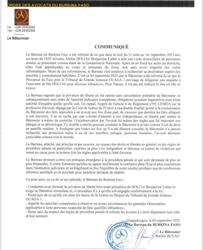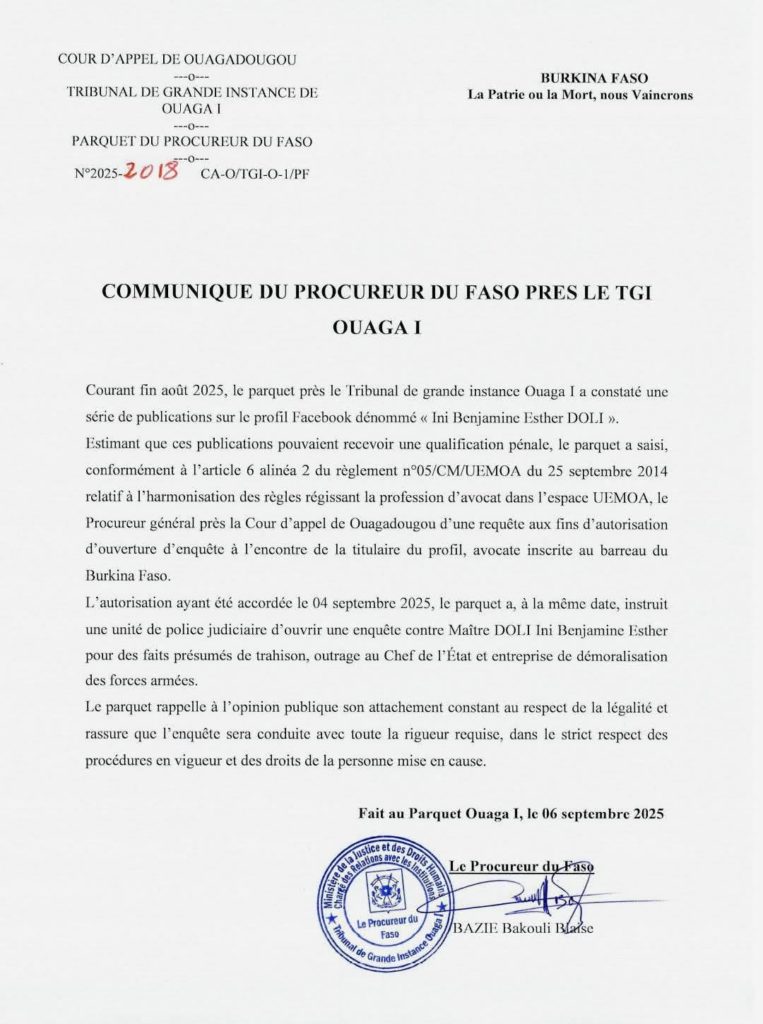 Le parquet près le Tribunal de grande instance (TGI) de Ouaga I a annoncé l’ouverture d’une enquête contre Maître Ini Benjamine Esther DOLI, avocate inscrite au barreau du Burkina Faso. Le barreau avait déjà publié un communiqué sur cette affaire.