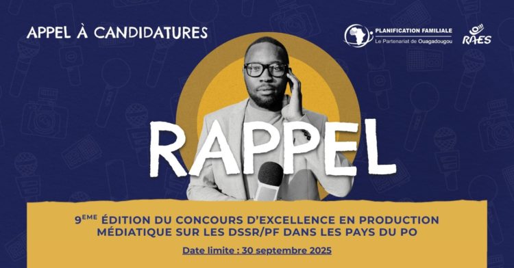 L’Unité de coordination du Partenariat de Ouagadougou (UCPO) et le Réseau africain d’éducation pour la santé (RAES) annoncent le lancement de la 9ᵉ édition du Concours d’excellence en production médiatique sur les Droits et la Santé Sexuels et Reproductifs/Planification Familiale (DSSR/PF).