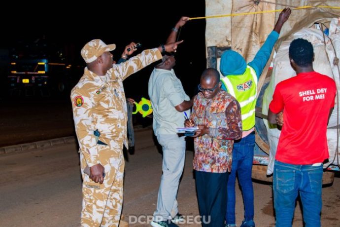 Sous les projecteurs, les techniciens de l’ONASER ont procédé à la vérification des dimensions des camions en circulation. Sur une dizaine de véhicules inspectés, un camion affichait une longueur de 13,40 mètres, au lieu des 12 mètres autorisés.