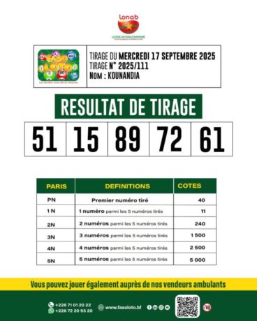 Accueil/Alertes 24h/24/Communiqué | FASO LOTO 5/90 – « Kounandia» Mercredi 17 Septembre 2025 Communiqué | FASO LOTO 5/90 – « Kounandia» Mercredi 17 Septembre 2025 Webmaster B24 Envoyer un courriel 17/09/20250 Moins d’une minute Partage Tirage N° 2025/111 Les numéros gagnants sont : 51– 15 – 89– 72 – 61 Et si le prochain millionnaire, c’était vous ? Jouez dès maintenant sur www.fasoloto.bf – rapide, simple et sécurisé Ou rendez-vous chez nos vendeurs ambulants. Faso Loto, le rendez-vous de la chance ! Jeu interdit aux moins de 18 ans. Jouez avec responsabilité. https://burkina24.com/wp-content/uploads/2025/09/WhatsApp-Video-2025-09-17-a-20.14.51_aae4d1fe.mp4 Webmaster B24 Envoyer un courriel 17/09/20250 Moins d’une minute Linkedin Messenger Messenger WhatsApp Telegram Partager par email Imprimer