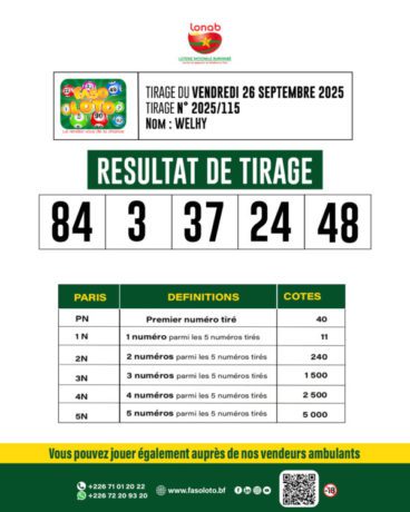 Accueil/Actualité/communiqués de presse/Communiqué | FASO LOTO 5/90 – « Welhy » – Vendredi 26 Septembre 2025 Communiqué | FASO LOTO 5/90 – « Welhy » – Vendredi 26 Septembre 2025 Webmaster B24 Envoyer un courriel 26/09/20250 Moins d’une minute Partage Résultats du Tirage – Vendredi 26 Septembre 2025 Tirage N° 2025/115 Les numéros gagnants sont : 84 – 3 – 37 – 24 – 48 Et si le prochain grand gagnant, c’était vous ? Misez dès maintenant sur www.fasoloto.bf – rapide, simple et sécurisé Ou jouez auprès de nos vendeurs ambulants. Faso Loto, le rendez-vous de la chance Jeu interdit aux moins de 18 ans. Jouez avec responsabilité. https://burkina24.com/wp-content/uploads/2025/09/IMG_8092-1.mp4 Webmaster B24 Envoyer un courriel 26/09/20250 Moins d’une minute Linkedin Messenger Messenger WhatsApp Telegram Partager par email Imprimer