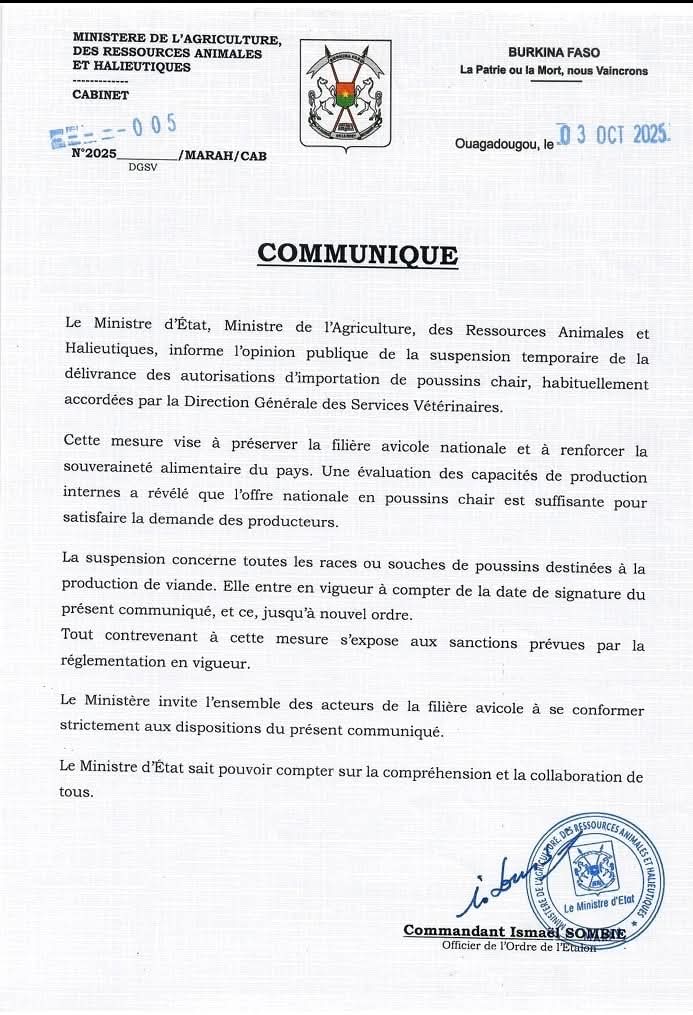 ‎Le ministre d’État, Commandant Ismaël Sombié, appelle l’ensemble des acteurs de la filière avicole à se conformer strictement aux prescriptions de ce communiqué, en réaffirmant compter sur leur compréhension et leur collaboration.