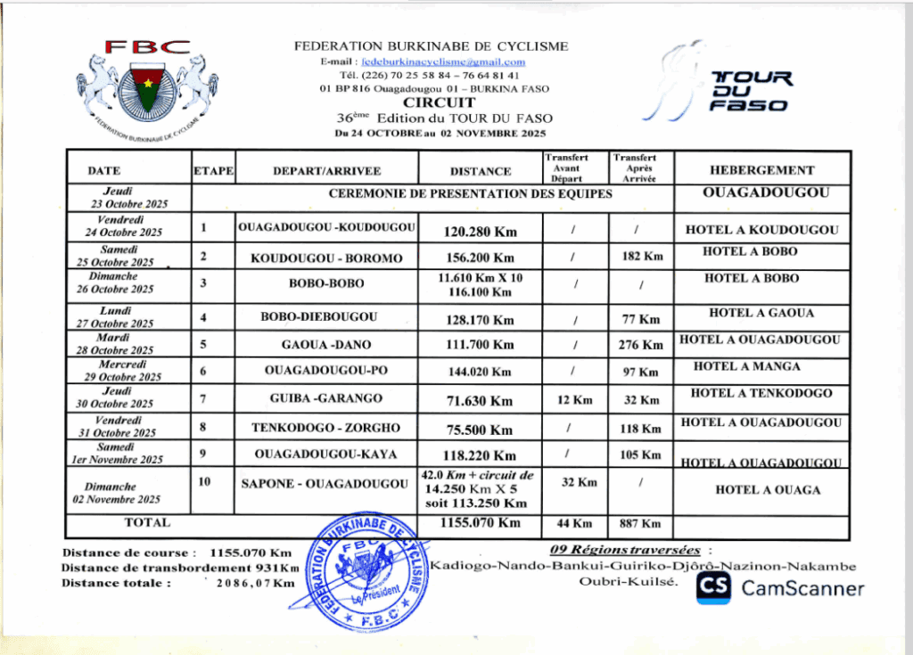 Le comité d’organisation de la 36e édition du Tour du Faso a tenu une conférence de presse le jeudi 2 octobre 2025 à Ouagadougou pour faire le point sur la tenue de la compétition. Le top départ est prévu pour le 24 octobre 2025 avec douze équipes attendues.
