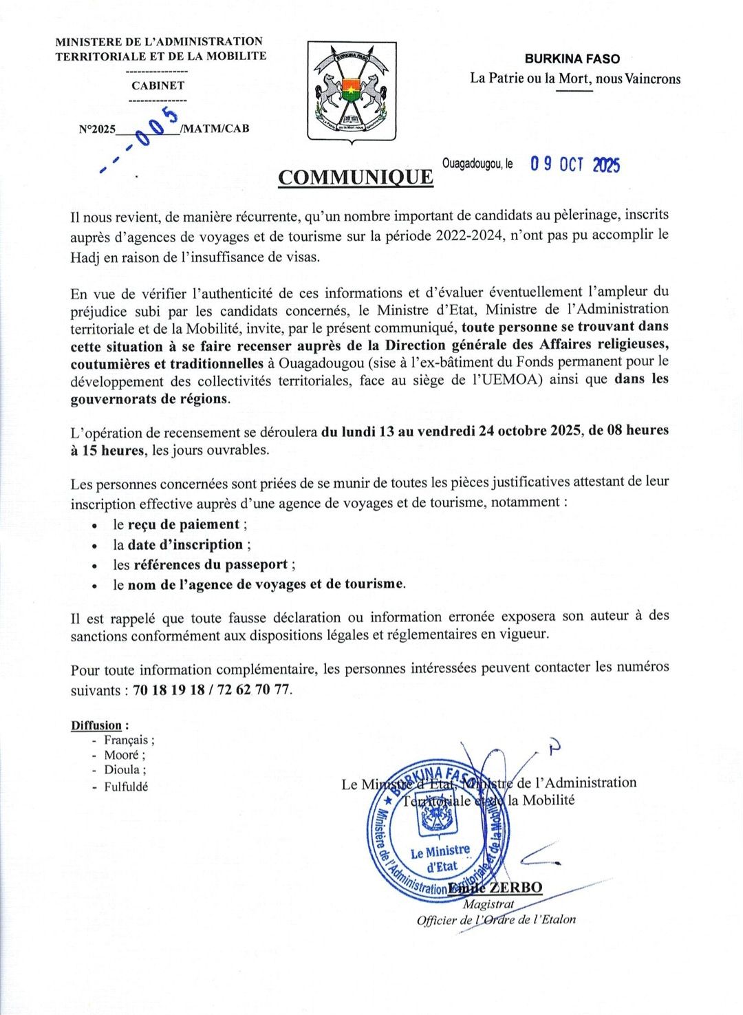 Le ministère de l’Administration territoriale et de la Mobilité lance, du 13 au 24 octobre 2025, une opération de recensement des candidats au pèlerinage à La Mecque inscrits entre 2022 et 2024, mais qui n’ont pas pu effectuer le voyage faute de visas.