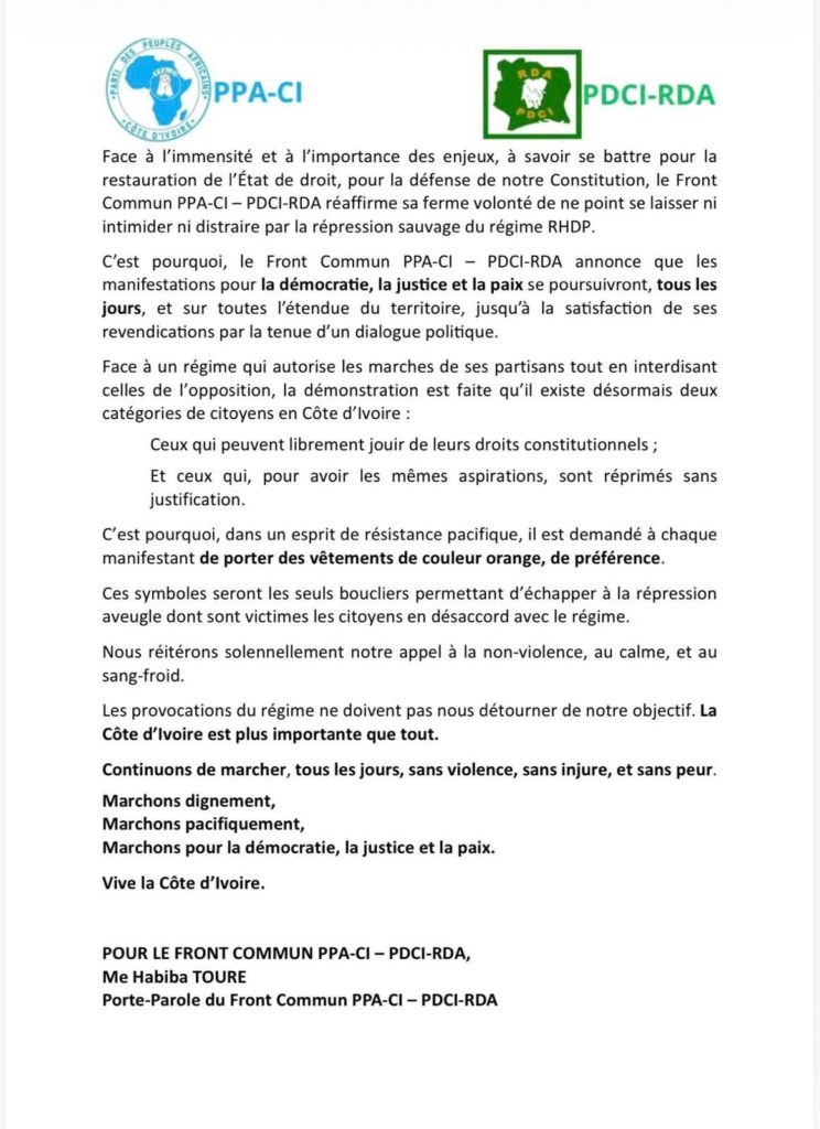 « Le Front Commun PPA-CI – PDCI-RDA annonce que les manifestations pour la démocratie, la justice et la paix se poursuivront, tous les jours, et sur toute l’étendue du territoire, jusqu’à la satisfaction de ses revendications par la tenue d’un dialogue politique. »