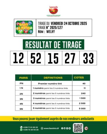Communiqué | FASO LOTO 5/90 – « Welhy» Résultats du Tirage – Vendredi 24 Octobre 2025