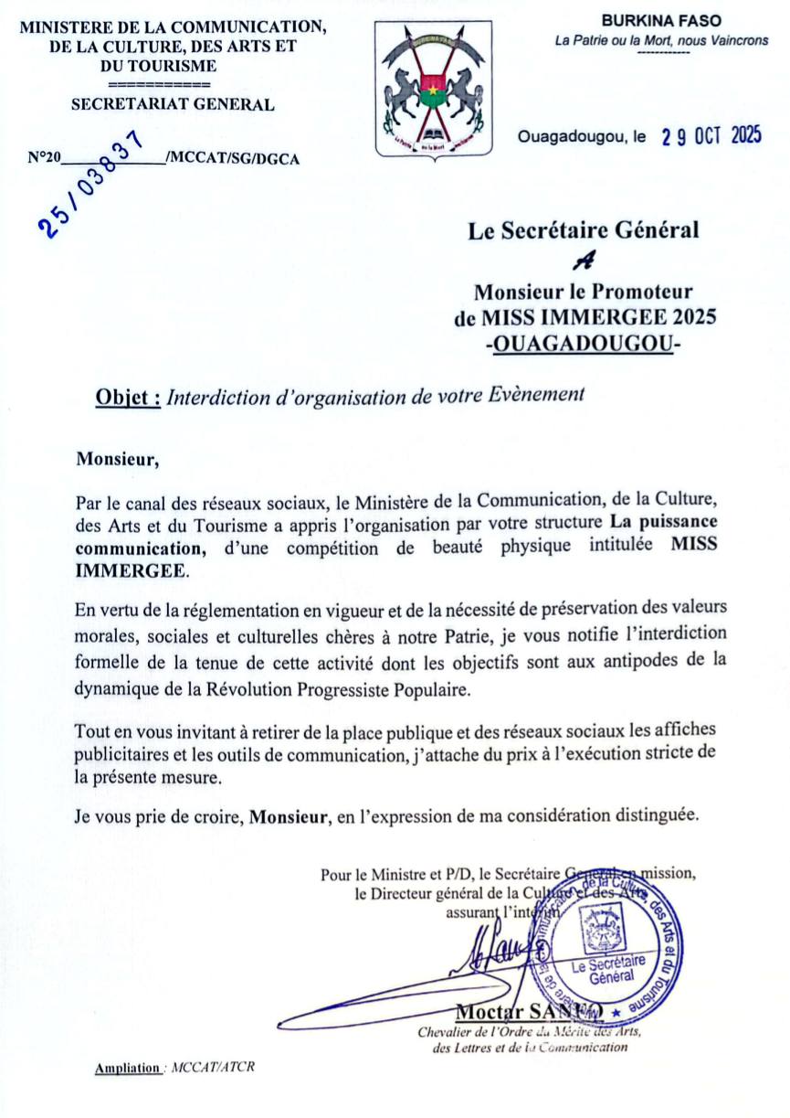 Le Ministère de la Communication, de la Culture, des Arts et du Tourisme (MCCAT) a annoncé, à travers un communiqué officiel signé par le Secrétaire général Moctar SANFO, l’interdiction de la tenue de la compétition de beauté dénommée « Miss Immergée 2025 », organisée par la structure La Puissance Communication.