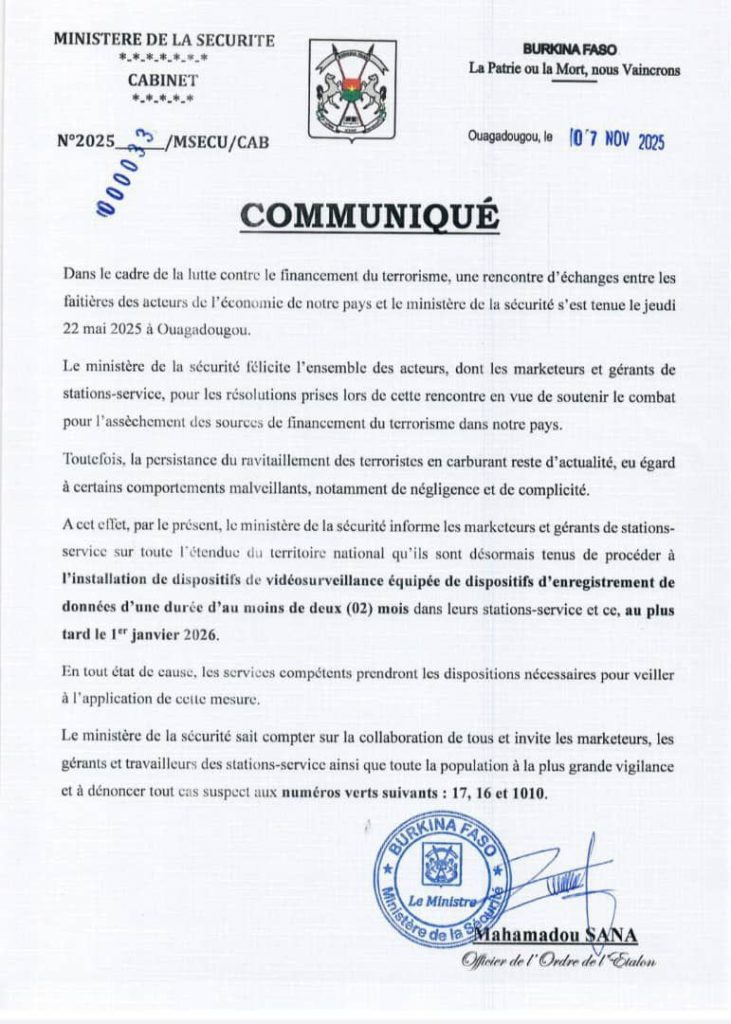 Dans le cadre du renforcement de la lutte contre le financement du terrorisme, le ministère de la Sécurité a annoncé de nouvelles mesures concernant les stations-service sur l’ensemble du territoire national. L’information a été rendue publique à travers un communiqué signé du ministre de la Sécurité, Mahamadou SANA, à l’issue d’une rencontre tenue le 22 mai 2025 avec les faîtières des acteurs économiques.