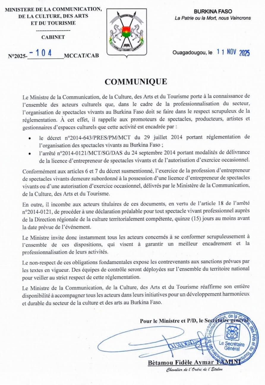 Dans un communiqué publié le 11 novembre 2025, le ministère souligne que cette activité doit se dérouler dans le respect scrupuleux de la réglementation en vigueur, notamment le décret n°2014-643/PRES/PM/MCT du 29 juillet 2014 et l’arrêté n°2014-0121/MCT/SG/DAS du 24 septembre 2014, qui fixent les conditions d’obtention de la licence d’entrepreneur de spectacles vivants et de l’autorisation d’exercice occasionnel.