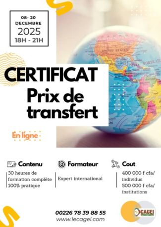 Le Centre Africain d’Expertise en Gestion, Économie et Innovation (CAGEI) informe le public de la tenue d’un séminaire international de formation certifiante sur les prix de transfert du 08 au 20 décembre 2025 en ligne