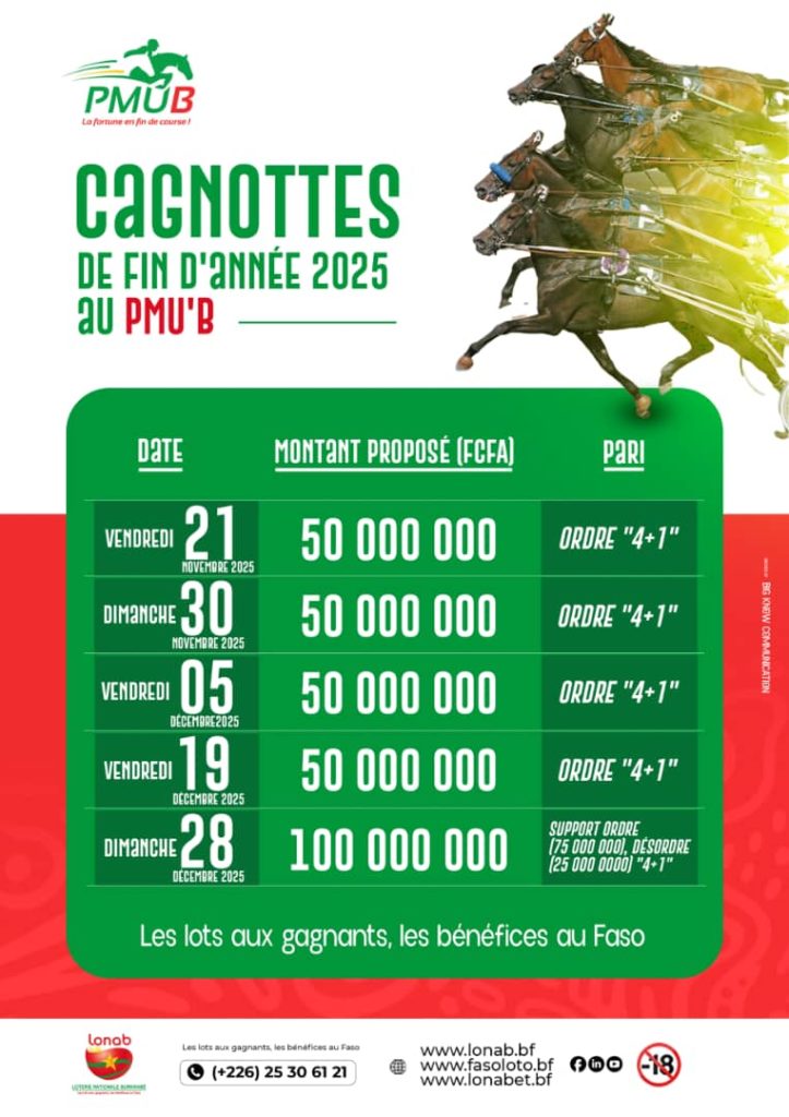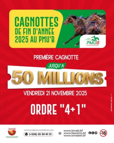 La LONAB lance une série de cagnottes de fin d’année qui promettent de faire vibrer les parieurs du PMU’B. Dès le vendredi 21 novembre 2025, les amateurs de turf auront l’occasion de tenter leur chance pour remporter jusqu’à 50 millions de FCFA sur le pari Ordre “4+1”.