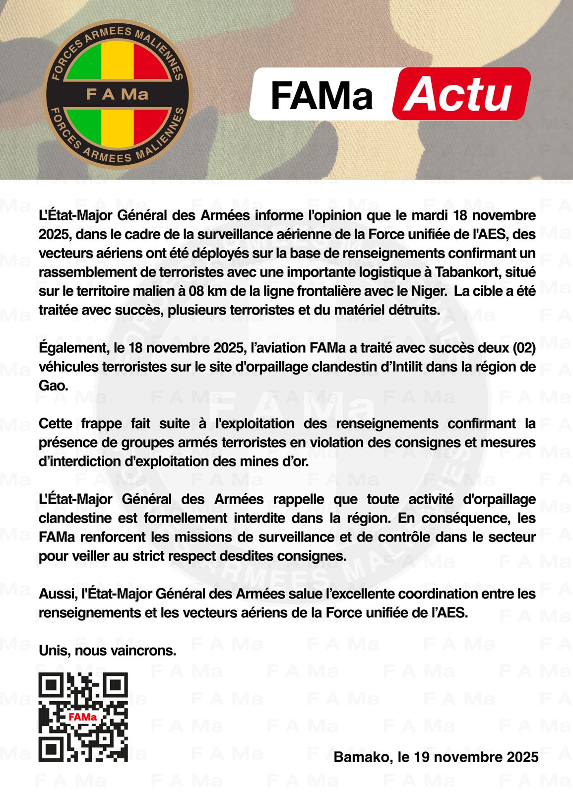 L’État-Major Général des Armées du Mali a annoncé avoir conduit, le mardi 18 novembre 2025, deux opérations aériennes majeures dans le cadre de la surveillance assurée par la Force unifiée de l’AES.