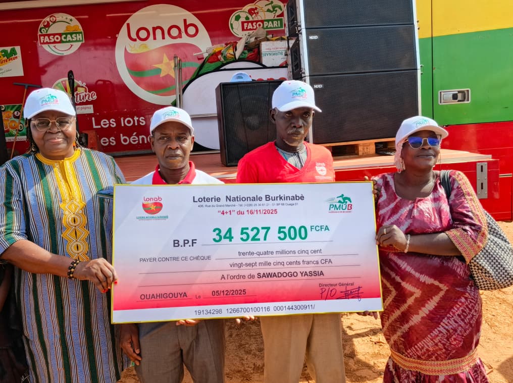 La Loterie Nationale Burkinabè (LONAB) a procédé, ce vendredi 5 décembre 2025 à Ouahigouya, à la remise d’un chèque de 34 527 500 FCFA à Yassia Sawadogo, cultivateur et gagnant du jeu 4+1. La cérémonie officielle s’est tenue en présence du représentant du Directeur général de l’institution, Yamba Jean Zida.
