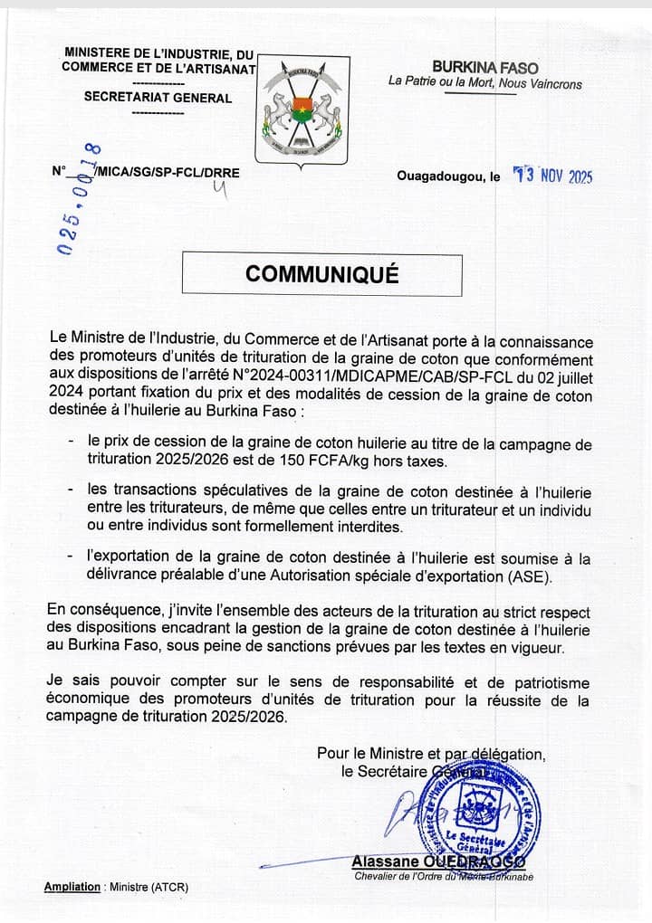 Le ministère de l’Industrie, du Commerce et de l’Artisanat (MICA) a rendu public un communiqué, daté du 13 novembre 2025, portant sur les conditions de gestion de la graine de coton destinée à l’huilerie pour la campagne de trituration 2025-2026.