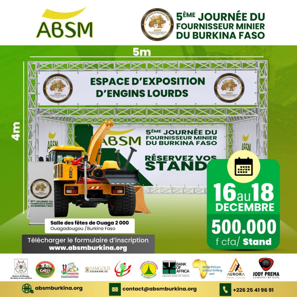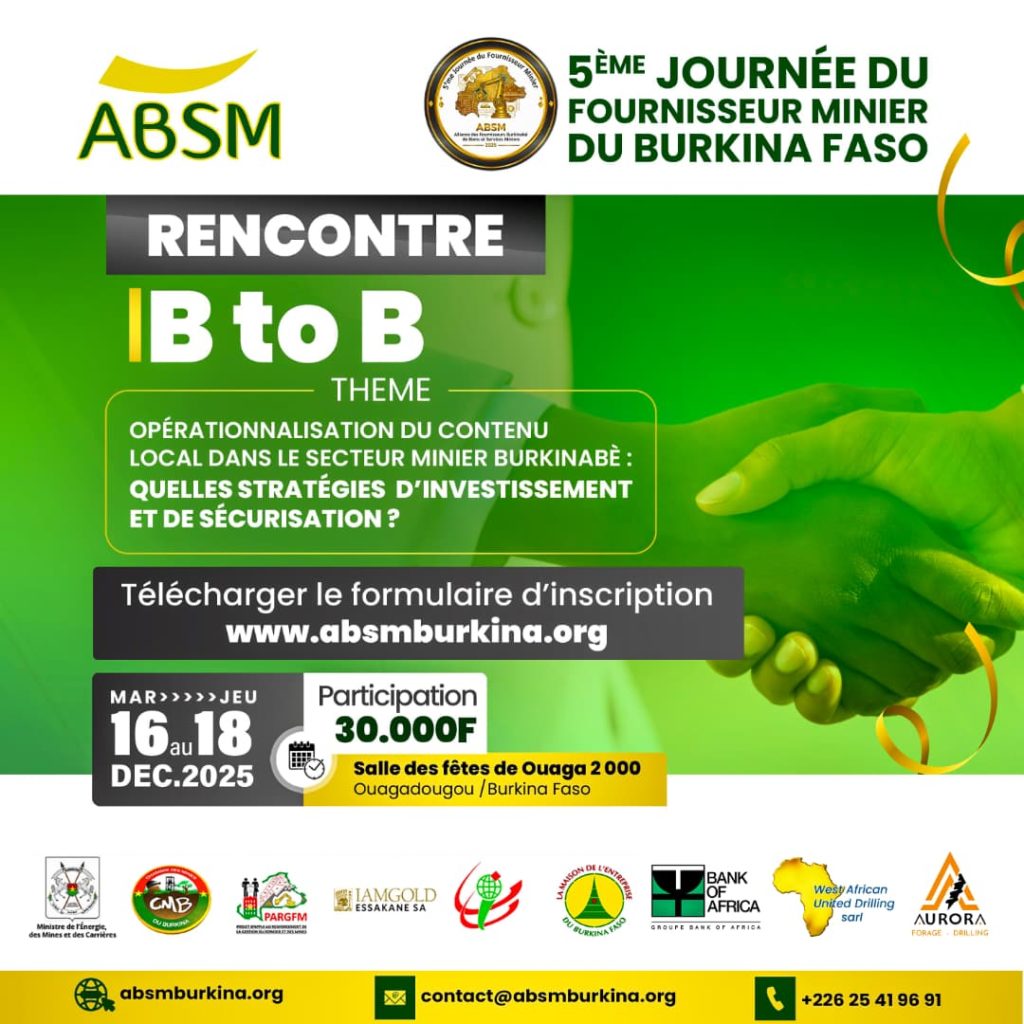 Dans le cadre de la 𝟓𝐞 𝐉𝐨𝐮𝐫𝐧𝐞́𝐞 𝐝𝐮 𝐅𝐨𝐮𝐫𝐧𝐢𝐬𝐬𝐞𝐮𝐫 𝐌𝐢𝐧𝐢𝐞𝐫 𝐝𝐮 𝐁𝐮𝐫𝐤𝐢𝐧𝐚 𝐅𝐚𝐬𝐨, plusieurs opportunités sont encore disponibles pour les acteurs du secteur minier