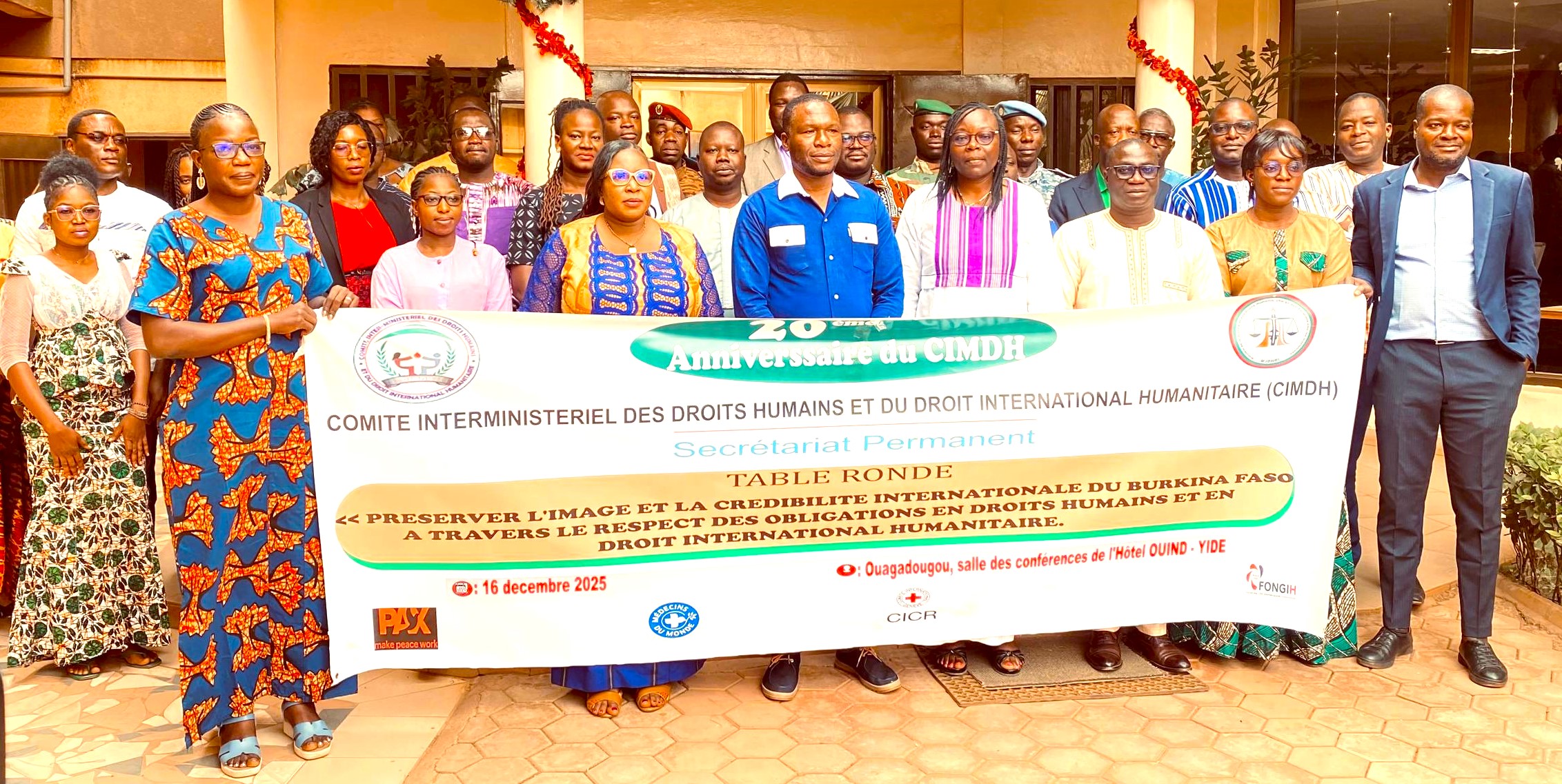 À l’occasion de son 20ᵉ anniversaire, le Comité interministériel des droits humains et du droit international humanitaire (CIMDH), en collaboration avec l’ONG néerlandaise PAX, a organisé, le mardi 16 décembre 2025, une table ronde réunissant des acteurs clés des droits humains. Les échanges ont porté sur le thème « Préserver l’image et la crédibilité internationale du Burkina Faso à travers le respect des obligations en droits humains et en droit international humanitaire ».