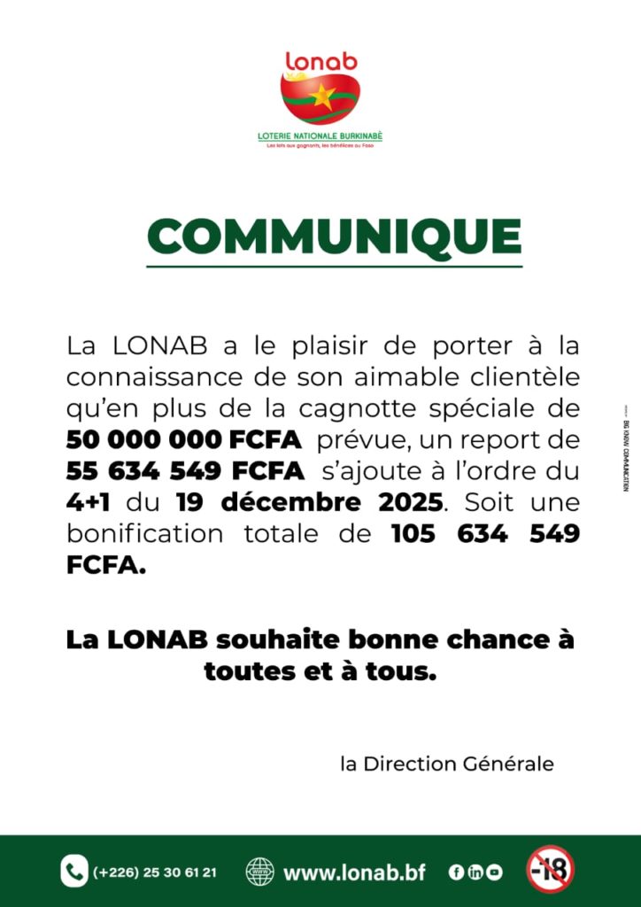 La LONAB a le plaisir de porter à la connaissance de son aimable clientèle qu’en plus de la cagnotte spéciale de 50 000 000 FCFA prévue, un report de 55 634 549 FCFA s’ajoute à l’ordre du 4+1 du 19 décembre 2025.