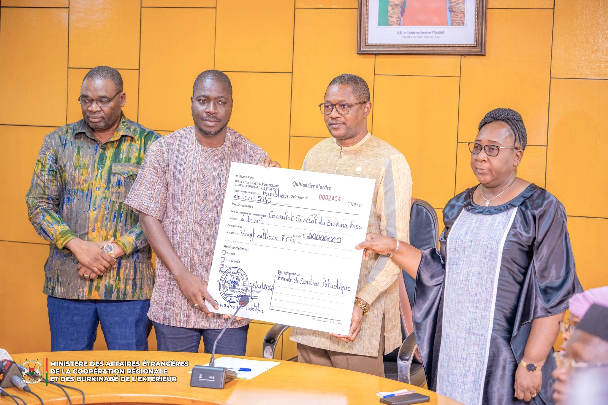 La délégation des Burkinabè vivant au Togo a remis au chef de la diplomatie la quittance d’une contribution de 20 millions de FCFA, fruit d’une mobilisation collective organisée à l’occasion des Journées d’Engagement patriotique et de participation citoyenne. En plus de cet apport financier, cette communauté a également collecté des dons en nature évalués à plus de 2 millions de FCFA, destinés aux personnes déplacées internes.