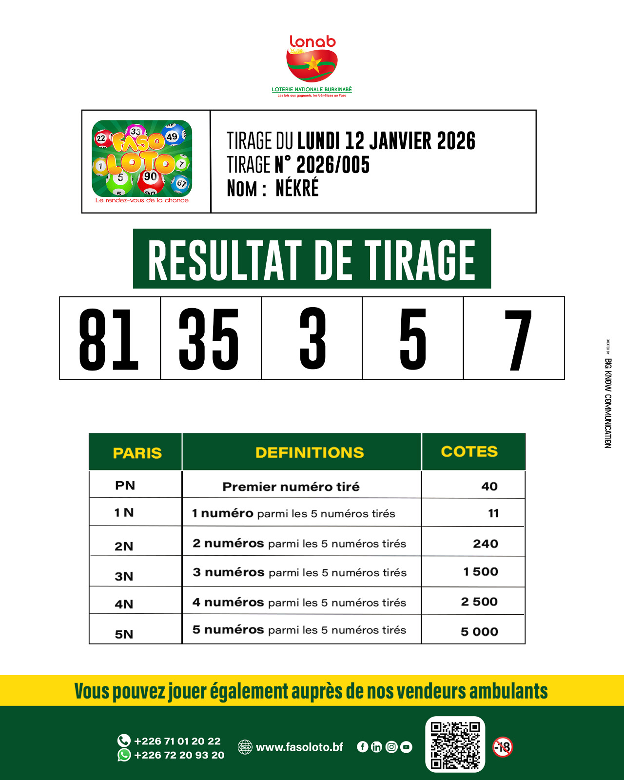 Accueil/Actualité/communiqués de presse/Communiqué | FASO LOTO 5/90 – « NÉKRÉ » – Tirage – Lundi 12 janvier 2026 Communiqué | FASO LOTO 5/90 – « NÉKRÉ » – Tirage – Lundi 12 janvier 2026 Webmaster B24 Envoyer un courriel il y a 18 heures0 Moins d’une minute TIRAGE FASO LOTO 5/90 – « NÉKRÉ » Résultats du tirage – Lundi 12 janvier 2026 Tirage N° 2026/005 Numéros gagnants : 81 – 35 – 03 – 05 – 07 La chance peut changer une vie ! Jouez dès maintenant sur www.fasoloto.bf Ou auprès de nos vendeurs ambulants agréés. Faso Loto, le rendez-vous de la chance ! Jeu interdit aux moins de 18 ans. Jouez avec responsabilité. Webmaster B24 Envoyer un courriel il y a 18 heures0 Moins d’une minute Linkedin Messenger Messenger WhatsApp Telegram Partager par email Imprimer