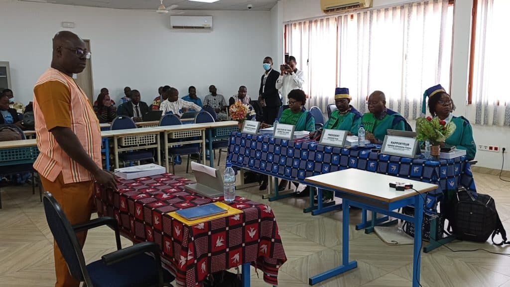 L’impétrant Yacinthe Sam présentant son document aux membres du jury