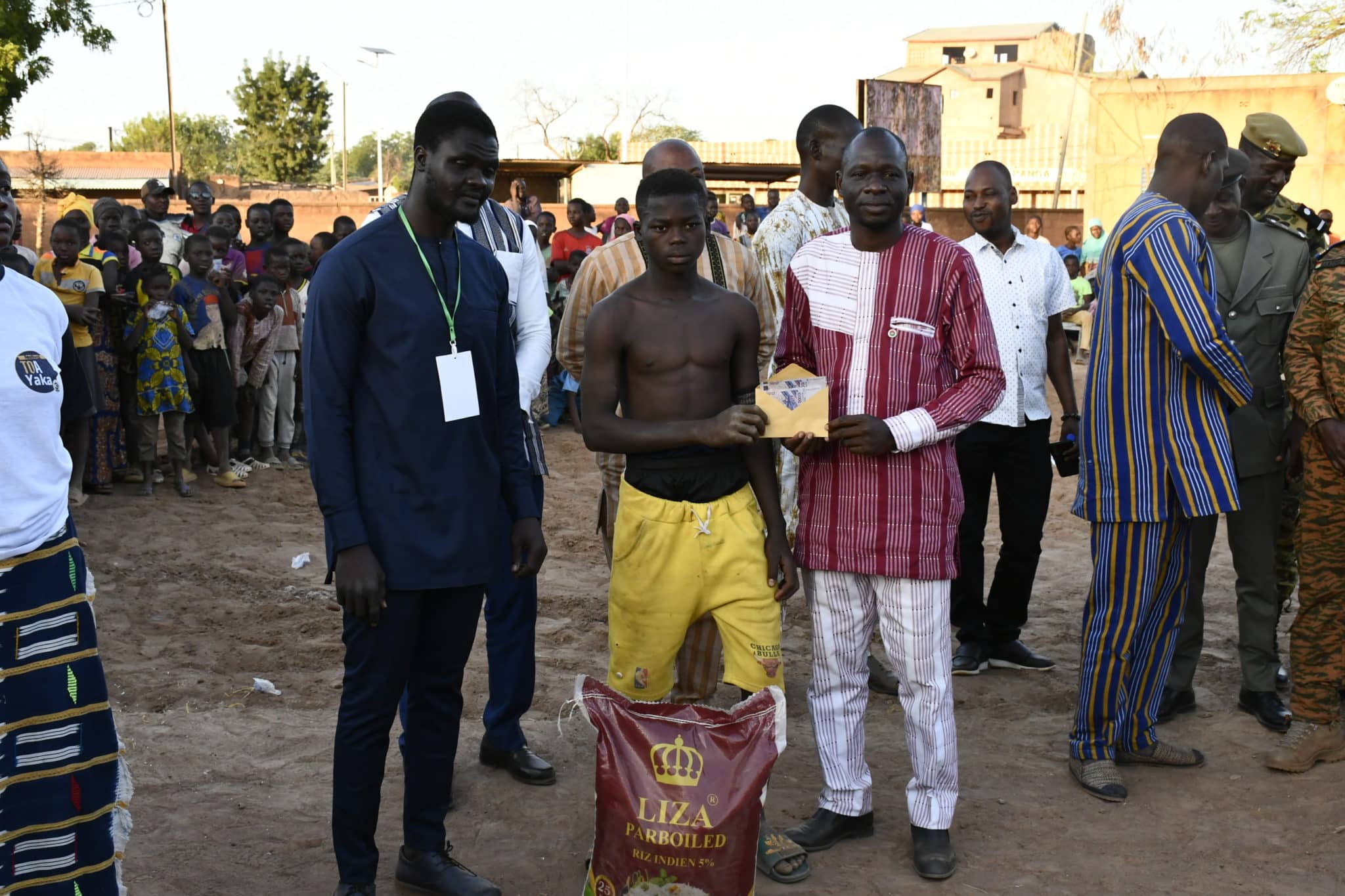 Désiré Badolo, Haut-Commissaire du Sourou et le promoteur du festival Toa Yaka Assimi Drabo remettent le prix au vainqueur de la compétition des petits