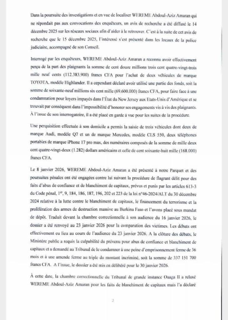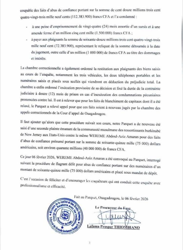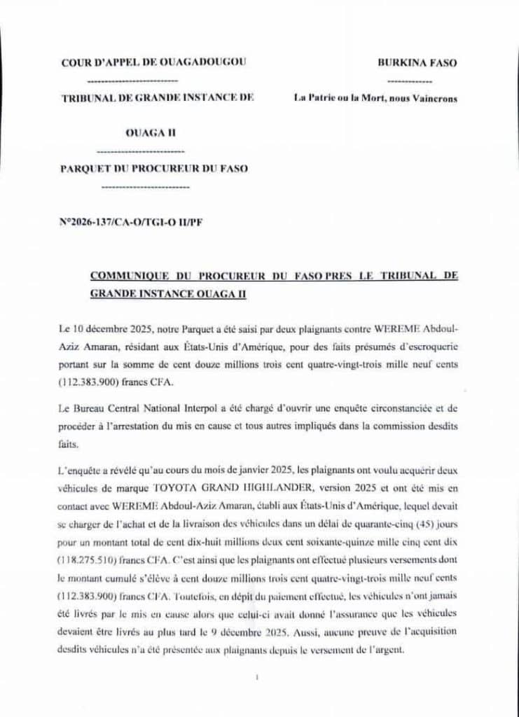 Le Procureur du Faso près le Tribunal de grande instance Ouaga II a communiqué, ce vendredi 6 février 2026, sur des développements judiciaires majeurs relatifs à l’affaire WEREME Abdoul-Aziz Amaran, ressortissant burkinabè résidant aux États-Unis, impliqué dans des dossiers de détournements de fonds.