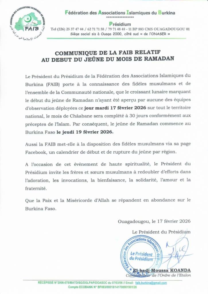 Le jeûne du Mois de Ramadan débute au Burkina Faso le jeudi 19 février 2026. Le croissant lunaire n’a pas été aperçu, informe la Fédération des Associations Islamiques du Burkina (FAIB).