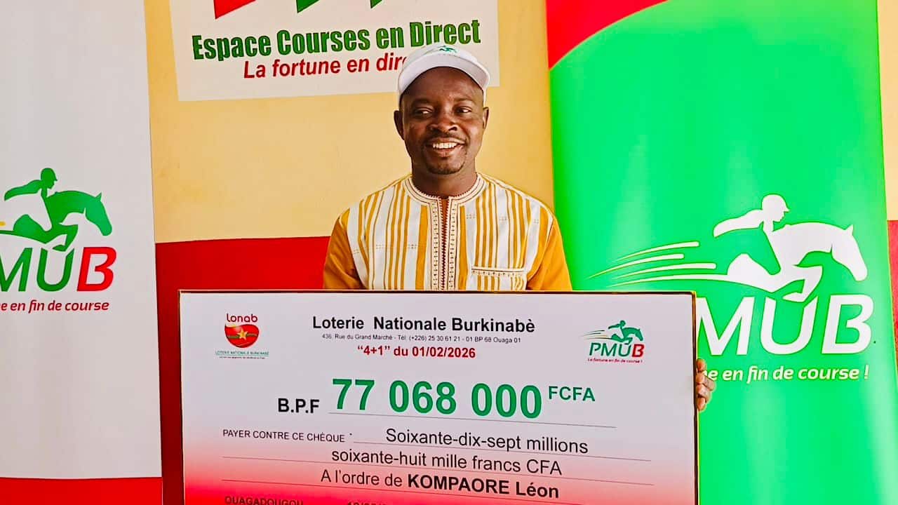 Grâce à une mise de 5 700 F CFA sur le 4+1 du vendredi 06 février 2026, Boureima Ilboudo a décroché la combinaison gagnante dans l’ordre, complétée par un bonus. Il est reparti avec la coquette somme de 45 222 000 F CFA.  Le second chanceux, Léon Kompaoré avec sa mise de 16 800 F CFA pour le 4+1 du dimanche 01 février 2026, a réalisé un coup de maître. En plus de l’ordre, il a cumulé trois bonus, portant son gain total à 77 068 000 F CFA.