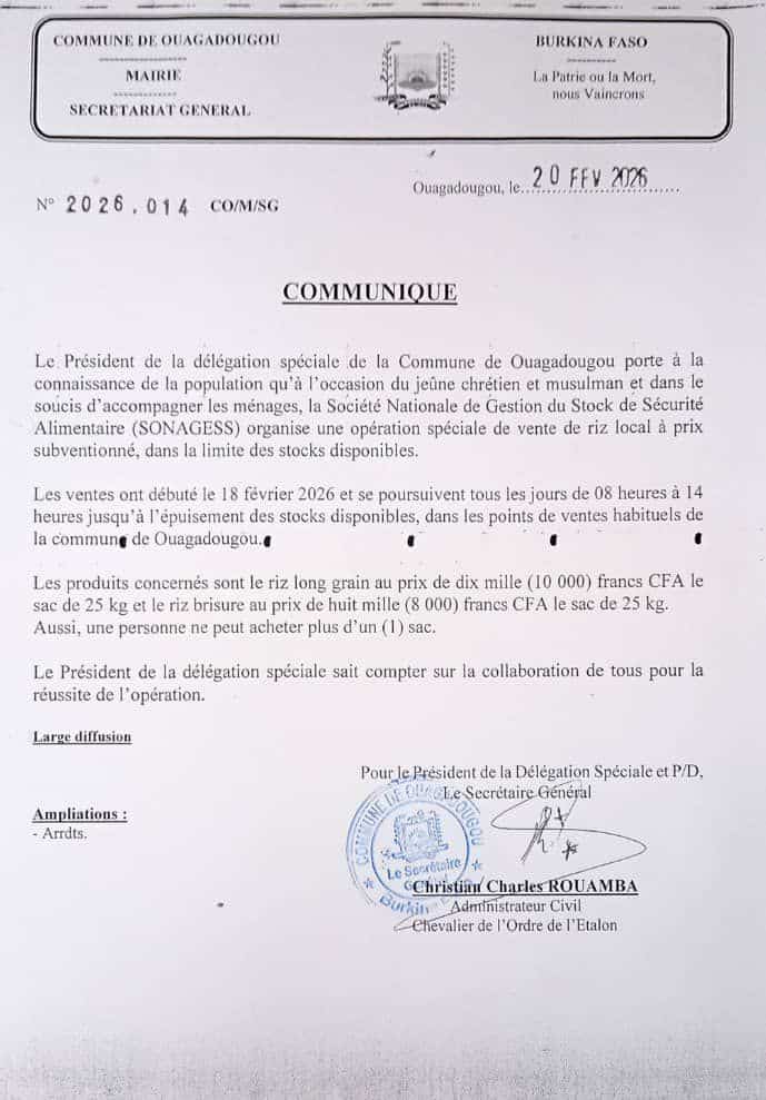 La Commune de Ouagadougou annonce une opération spéciale de vente de riz local à prix subventionné, à l’initiative de la Société Nationale de Gestion du Stock de Sécurité Alimentaire (SONAGESS). Cette mesure vise à soutenir les ménages à l’approche des périodes de jeûne chrétien et musulman.