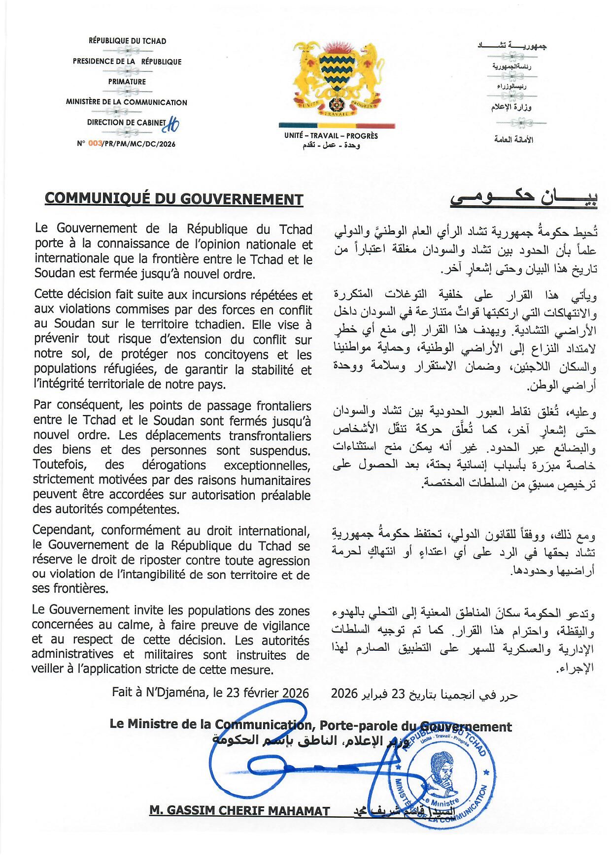 Les points de passage entre les deux pays sont désormais fermés. Les déplacements de personnes et de biens sont suspendus jusqu’à nouvel ordre. Toutefois, N’Djaména précise que des « dérogations exceptionnelles », strictement motivées par des raisons humanitaires et soumises à autorisation préalable, pourront être accordées.