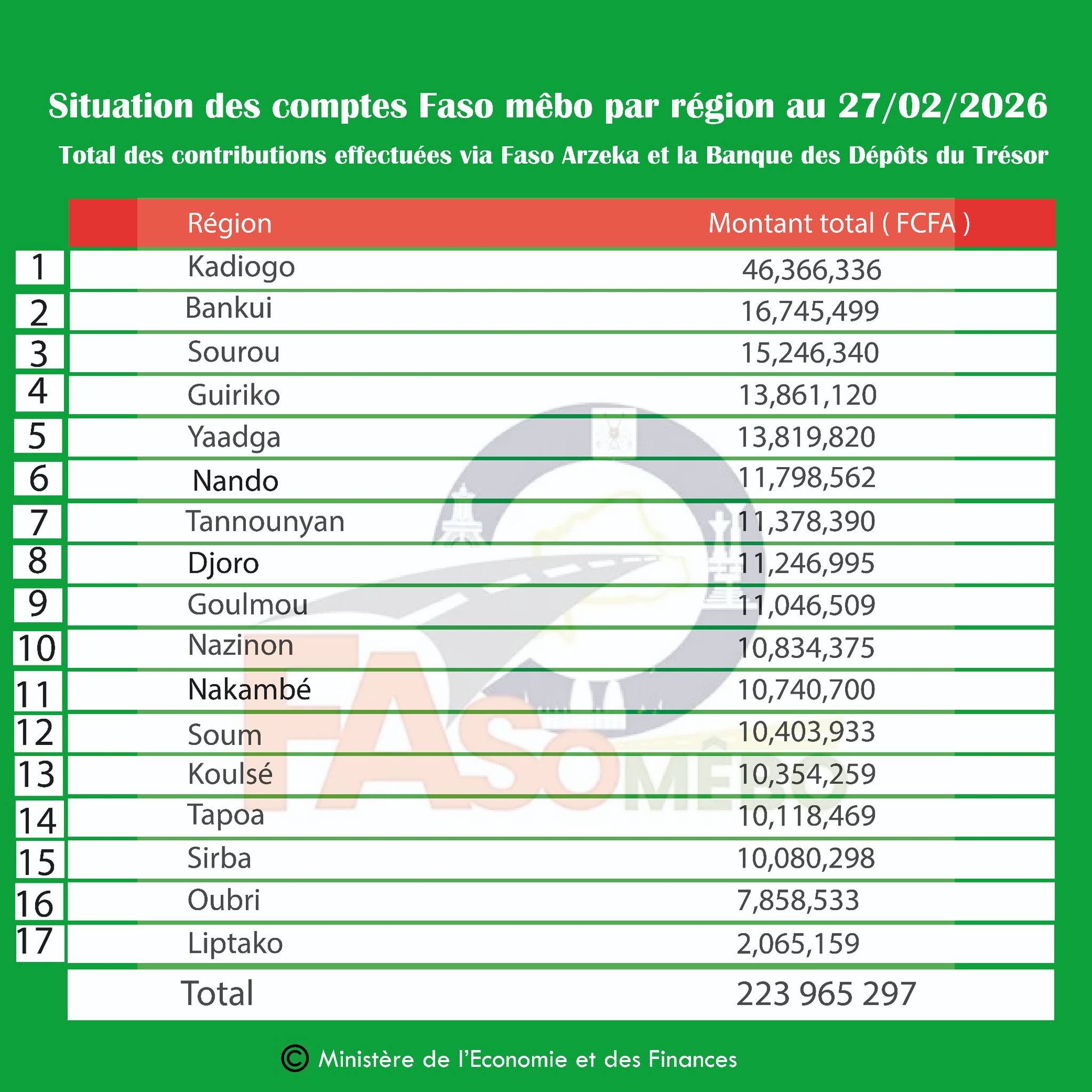 Le Ministère de l’Économie et des Finances a rendu public, ce dimanche 1er mars 2026, le point de situation des comptes de l’initiative « Faso Mêbo » à la date du 27 février 2026. Selon les chiffres officiels, l’élan patriotique a permis de mobiliser la somme totale de 223 965 297 FCFA à travers les différentes régions du pays.