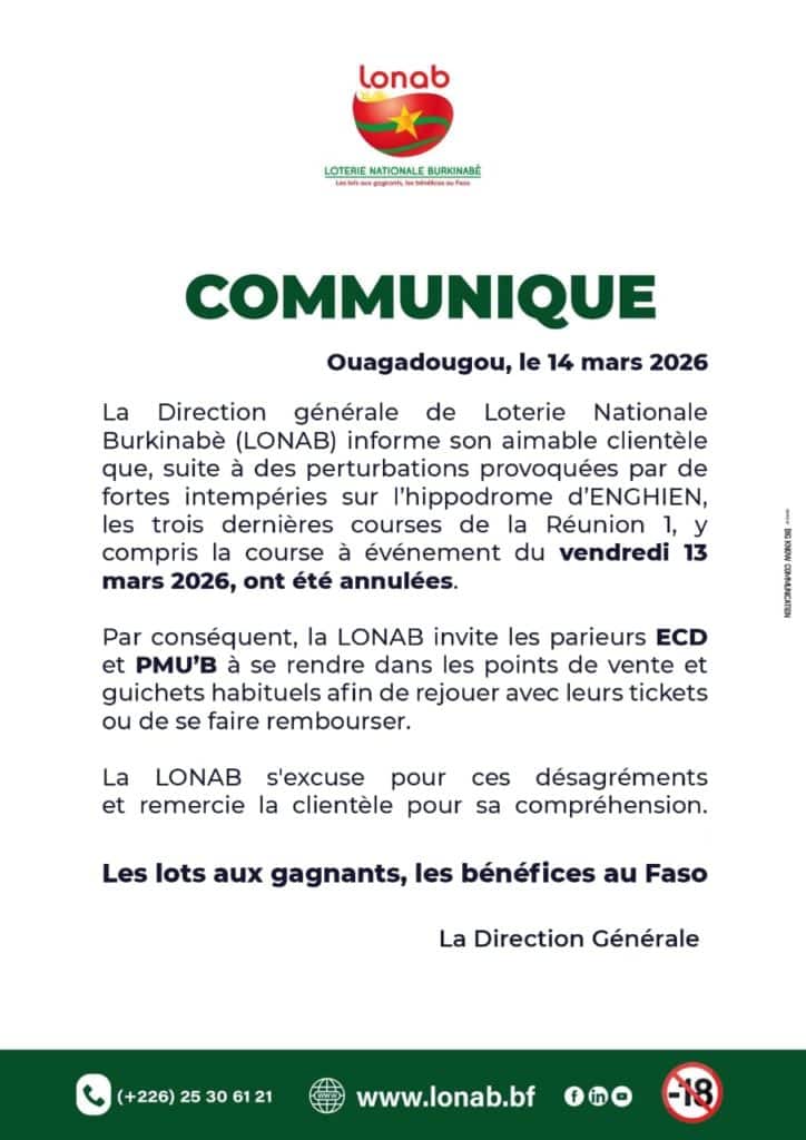 Communiqué | LONAB : Annulation de courses PMU du 13 mars 2026 et dispositions pour les parieurs