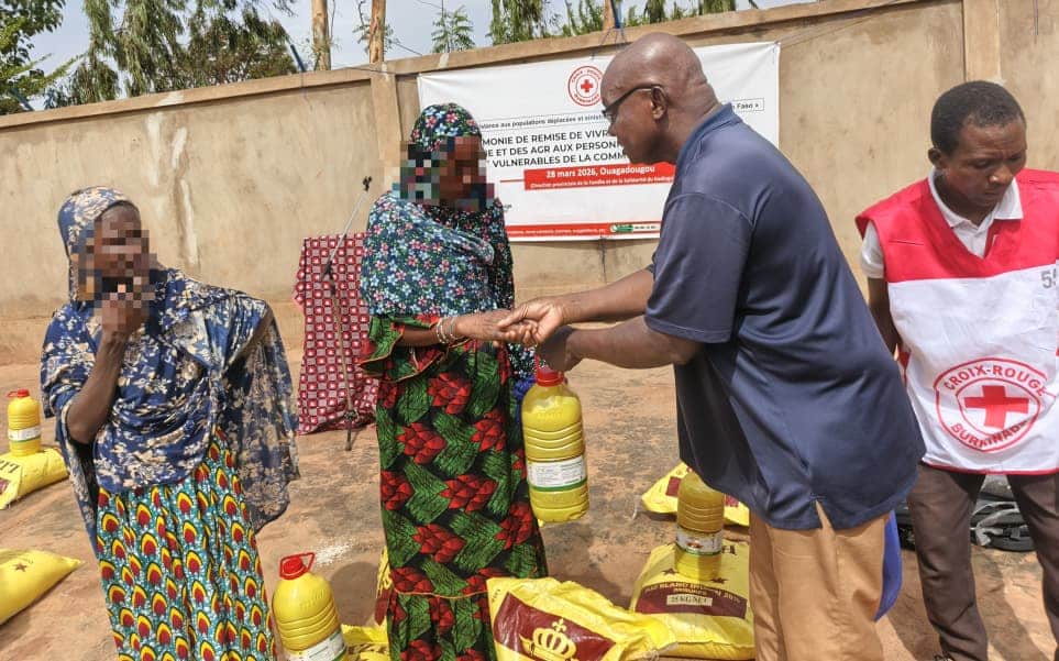 Dans le cadre du projet d’assistance aux personnes déplacées internes, aux sinistrés et aux communautés hôtes au Burkina Faso, la Croix-Rouge burkinabè a procédé, ce samedi 28 mars 2026 à Ouagadougou, à une remise de vivres (riz, huile, savon et autres produits de première nécessité), de kits scolaires, de kits d’hygiène ainsi que d’appuis financiers destinés au développement d’activités génératrices de revenus. Cette action a bénéficié aux personnes déplacées internes ainsi qu’aux familles hôtes vulnérables.