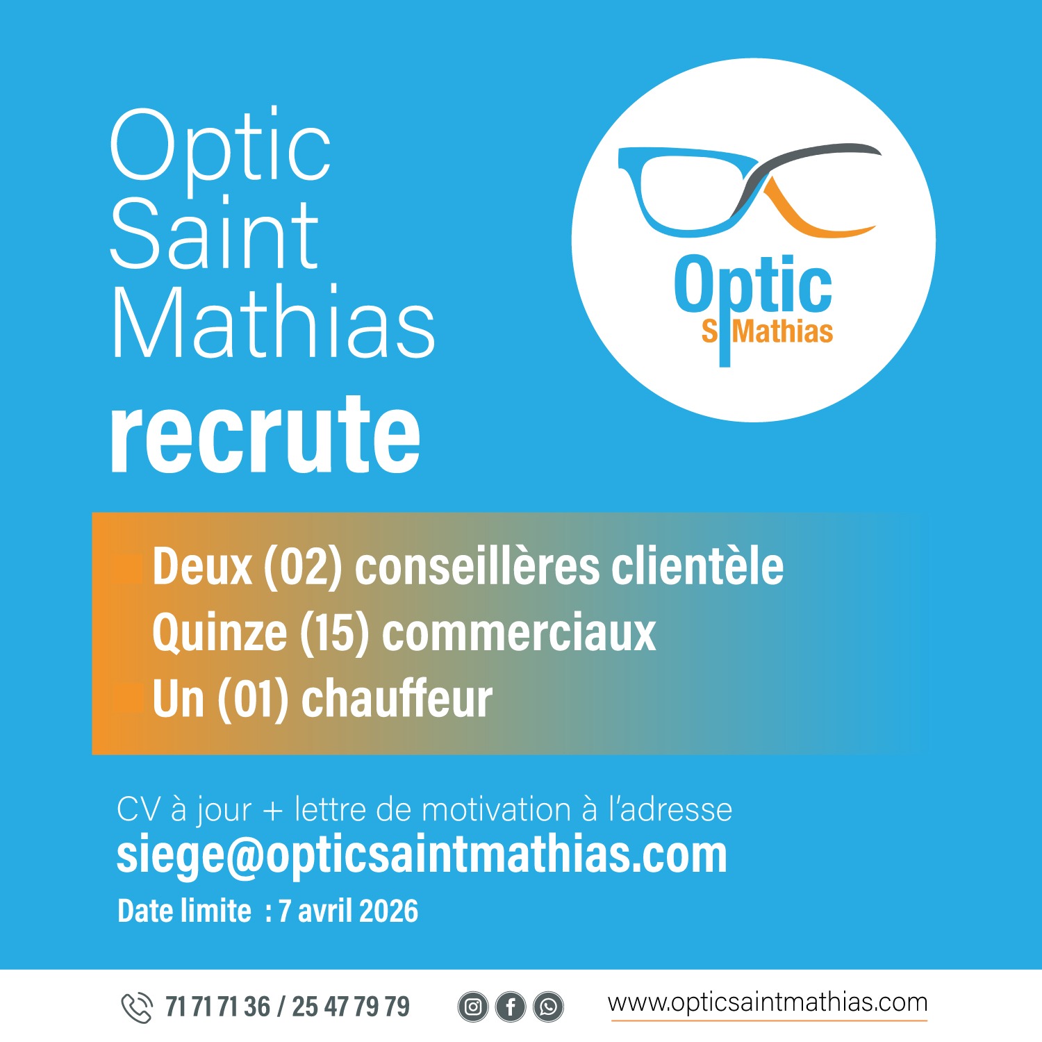 Communiqué | Optic Saint Mathias recrute deux (02) conseillères clientèle, 15 commerciaux et un (01) chauffeur