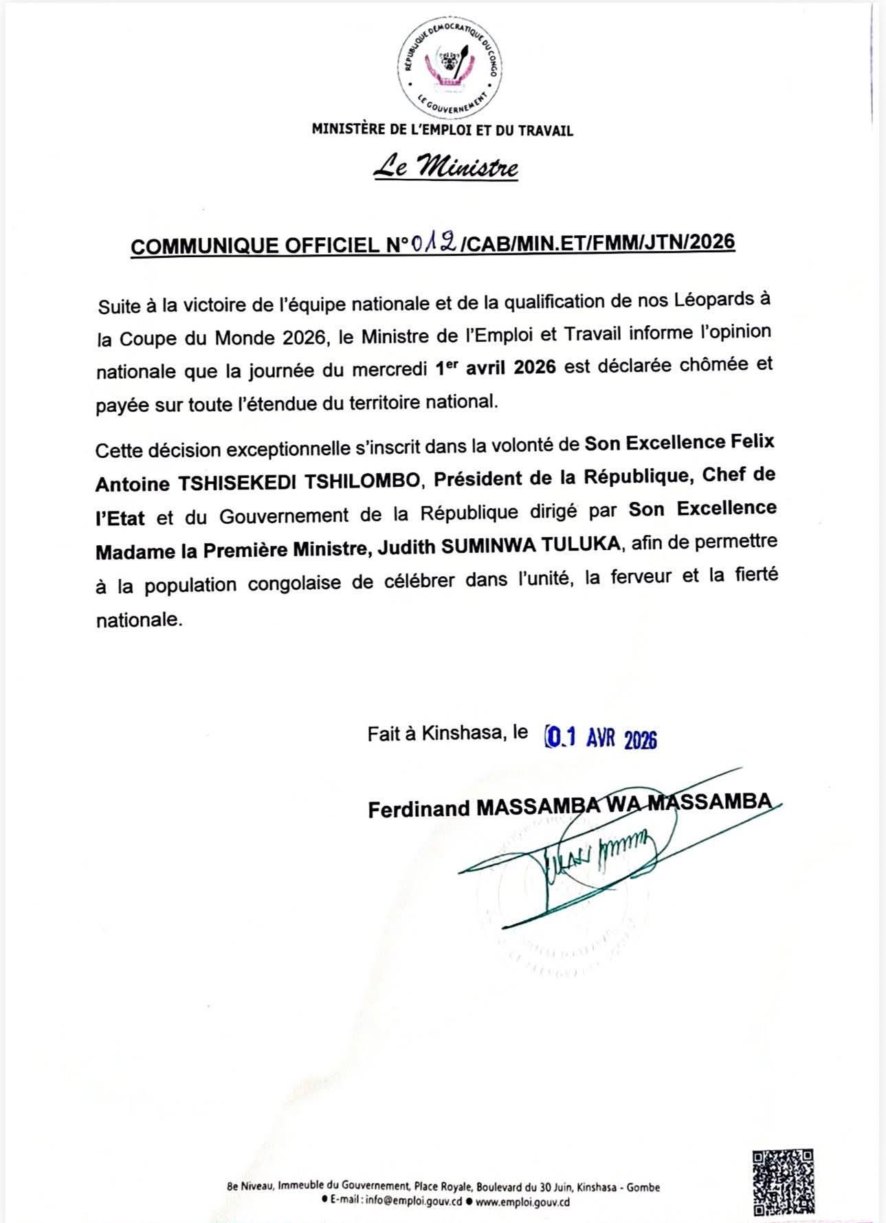 Les Léopards décrochent ainsi leur ticket pour la Coupe du monde 2026 et évolueront dans la même poule que le Portugal de Cristiano Ronaldo, la Colombie et l’Ouzbékistan.