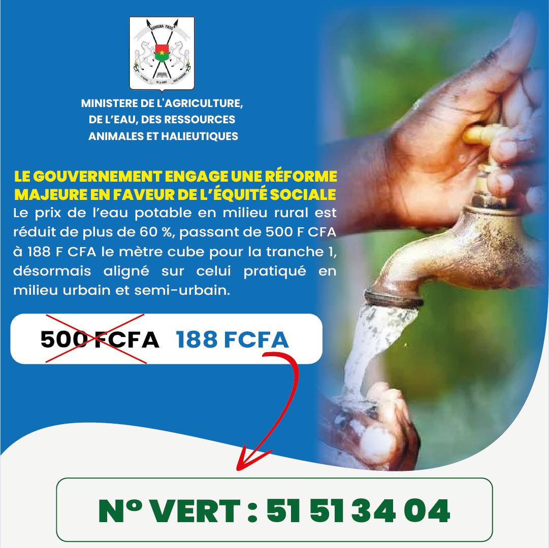 Cette décision s’inscrit pleinement dans la vision du camarade Président du Faso, Son Excellence le Capitaine Ibrahim TRAORE. Elle vise à garantir un accès équitable aux services essentiels pour toutes les populations, sans distinction, à réduire les inégalités sociales et à assurer une meilleure qualité de l’eau distribuée sur l’ensemble du territoire.