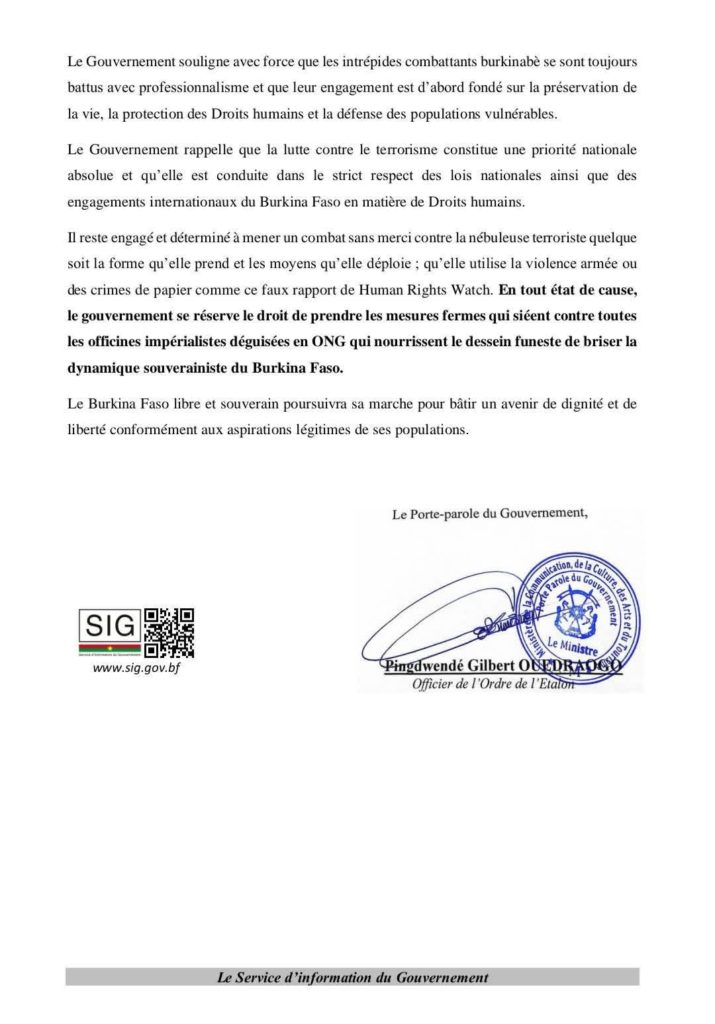 Le Gouvernement reste serein face à ces gesticulations, témoins du désarroi des forces néocoloniales et impérialistes, sponsors du terrorisme dans notre pays et dans le Sahel, qui entendent à travers Human Rights Watch imputer la responsabilité des massacres, viols, pillages, tueries et crimes odieux à nos valeureuses et loyales Forces de défense et de sécurité ainsi qu’à nos braves Volontaires pour la défense de la Patrie (VDP) alors même qu’elles en sont les vraies commanditaires voire les exécutants à travers les mercenaires envoyés en appui aux terroristes.