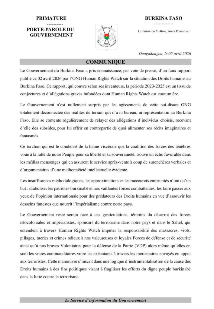 Le Gouvernement du Burkina Faso a pris connaissance, par voie de presse, d’un faux rapport publié ce 02 avril 2026 par l’ONG Human Rights Watch sur la situation des Droits humains au Burkina Faso.