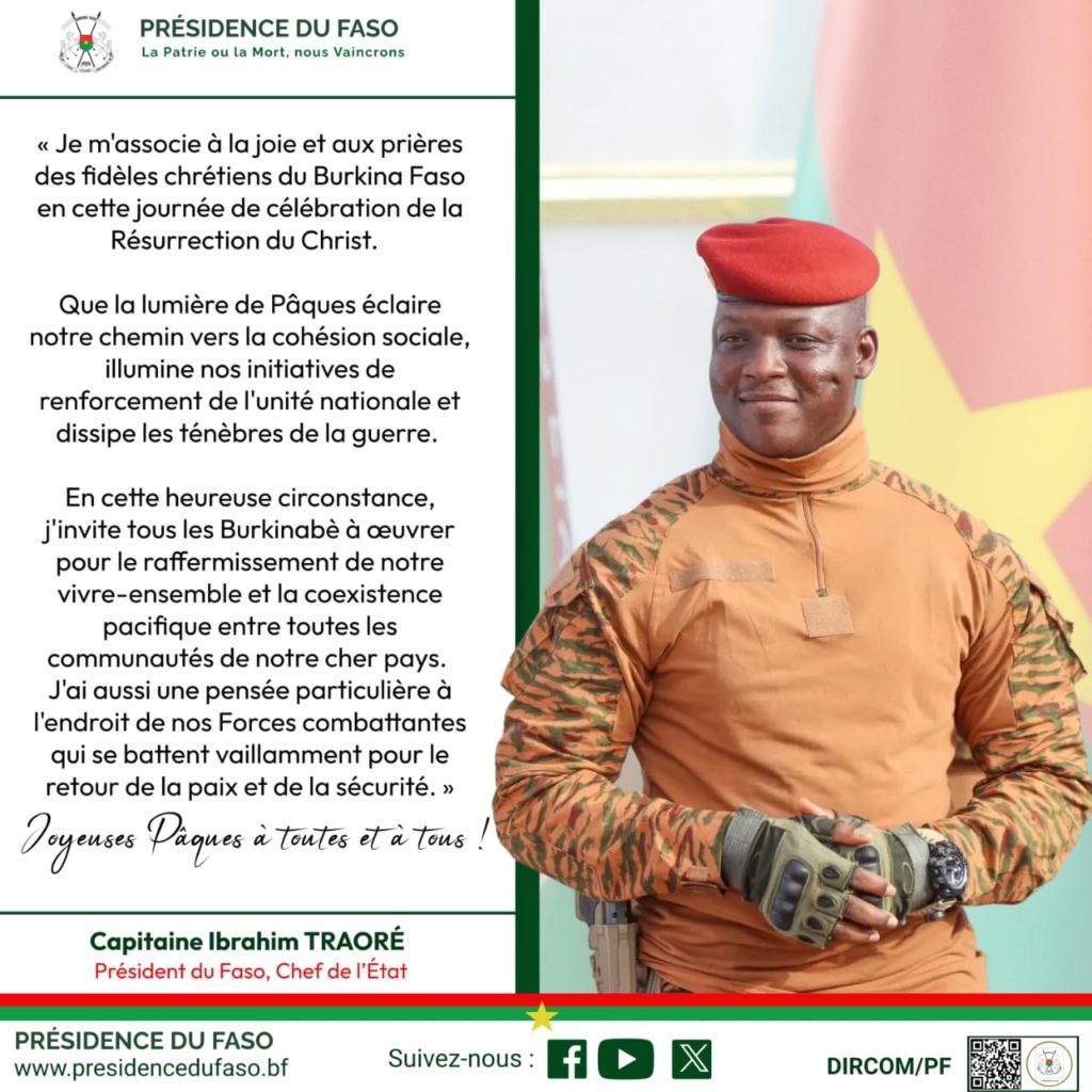 Lire aussi 👉🏿Pâques 2025 : « Puissent les faveurs divines accompagner nos forces combattantes » (Capitaine Ibrahim Traoré)