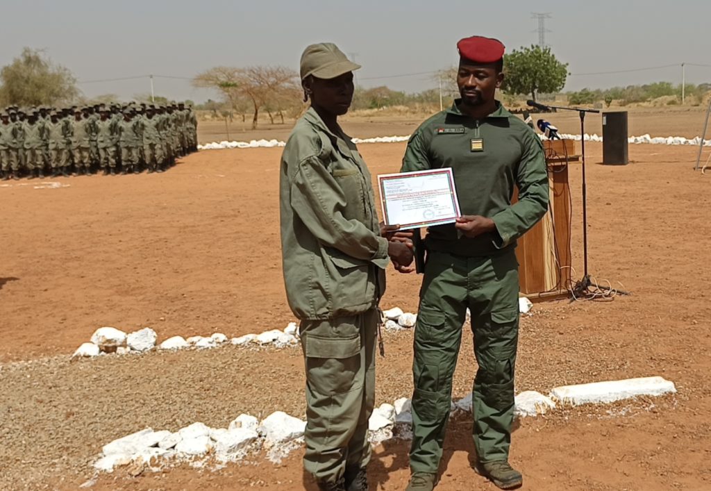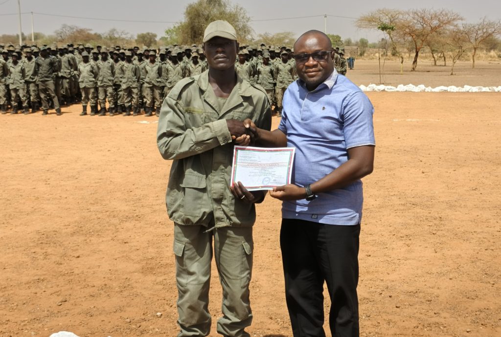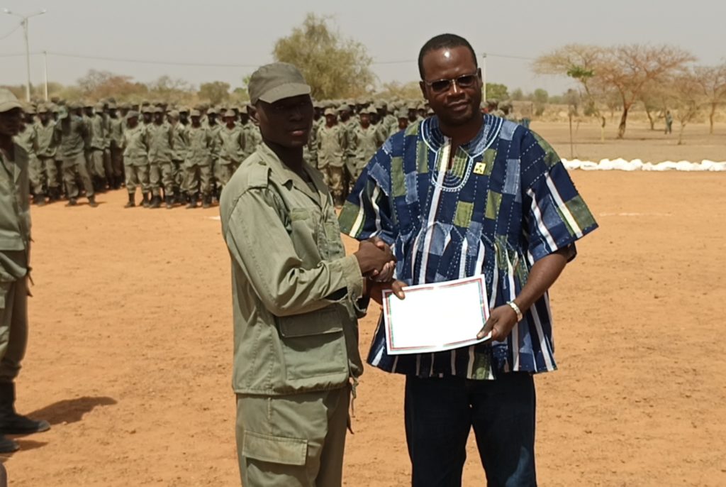 - Le Commandant du Centre national de formation des VDP (CNF-VDP), Capitaine Ousseni Zida, remettant une attestation de fin de formation à une des 376 femmes VDP agricoles de la 3e cohorte