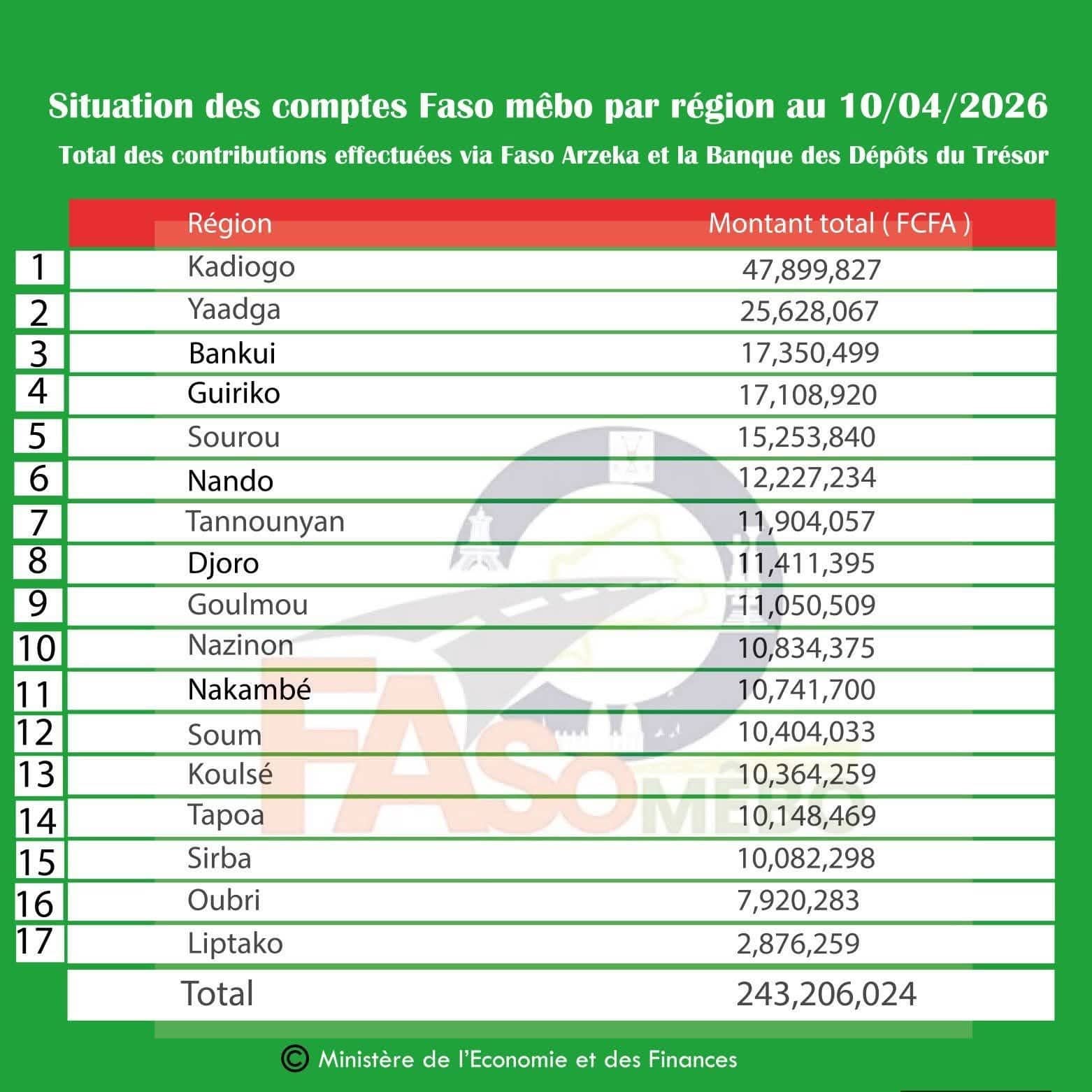 Le Ministère de l’Économie et des Finances a rendu publique, le 10 avril 2026, la situation actualisée des contributions au fonds « Faso Mêbo ». Le montant global mobilisé atteint désormais 243 206 024 FCFA, traduisant une dynamique citoyenne en constante progression à travers le pays.