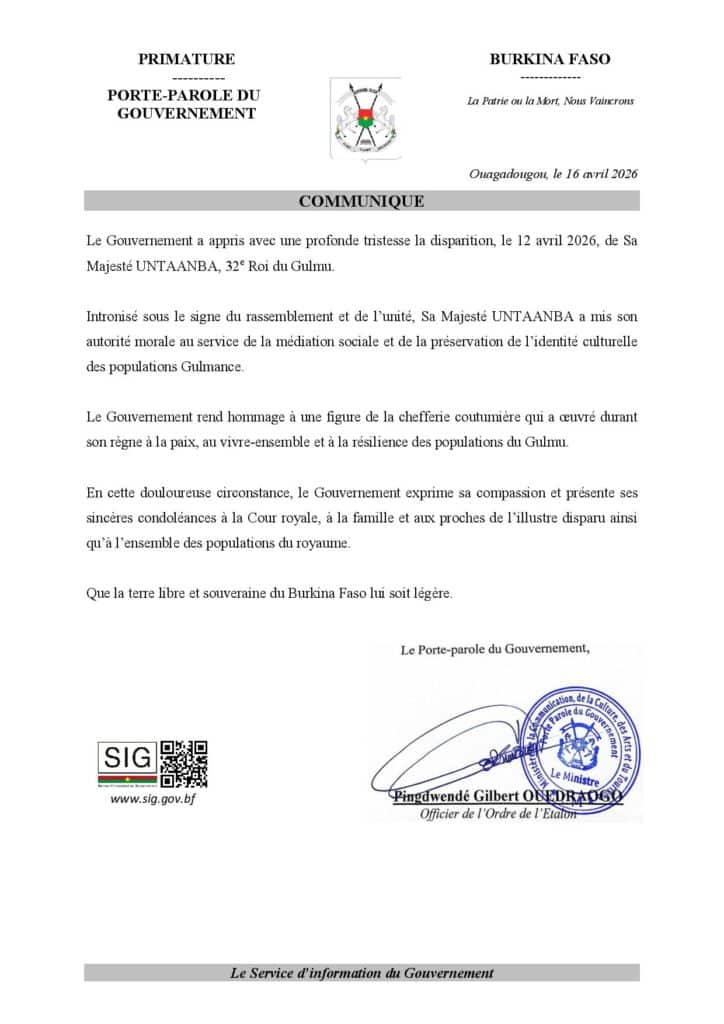 Le Gouvernement a appris avec une profonde tristesse la disparition, le 12 avril 2026, de Sa Majesté UNTAANBA, 32e Roi du Gulmu.