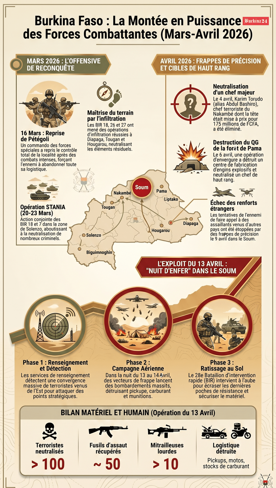 Le point d’orgue de cette offensive s’est déroulé dans la nuit du 13 au 14 avril dans la province du Soum. Grâce à un renseignement précis, les vecteurs aériens ont neutralisé une concentration massive de terroristes venus de l’Est, suivie d’un ratissage au sol par le 28e Bataillon d’Intervention Rapide (BIR).