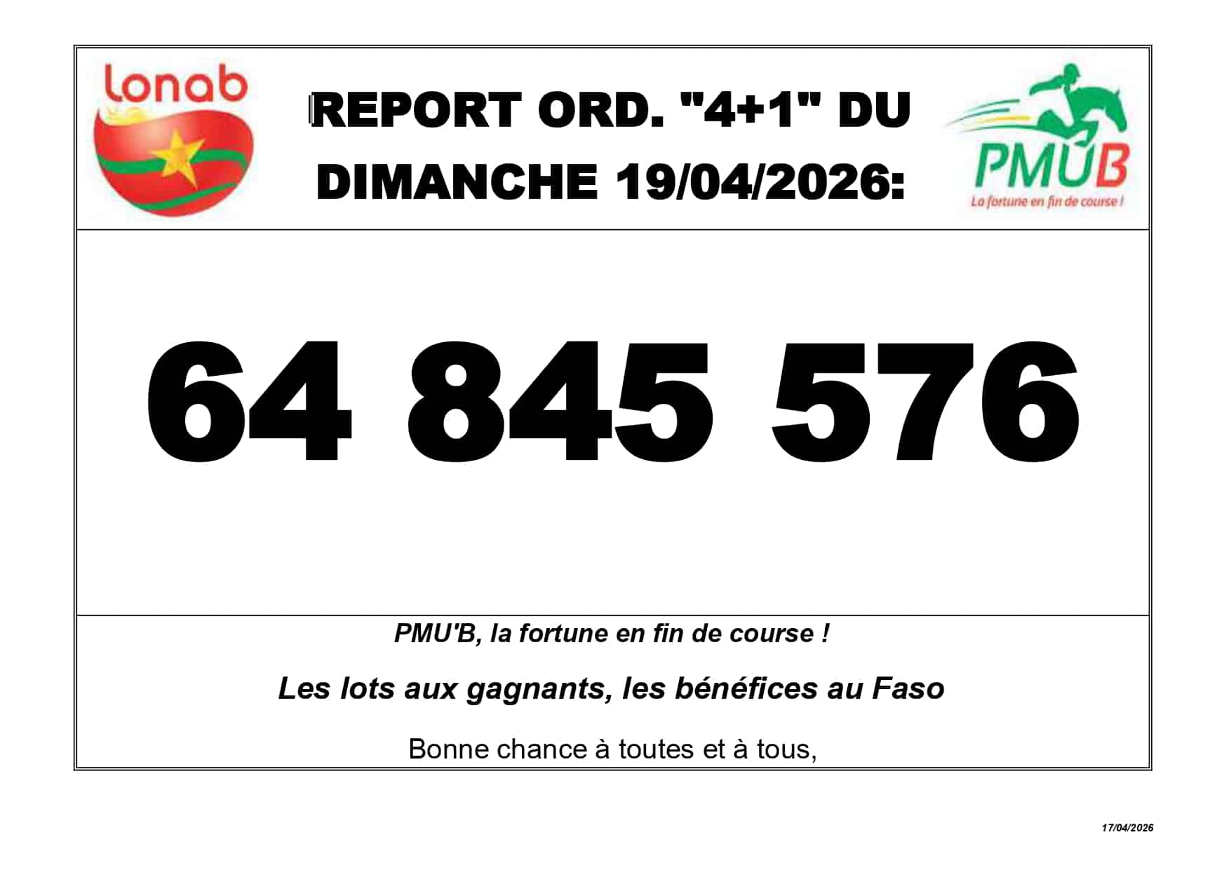 Accueil/Actualité/communiqués de presse/Communiqué | PMU’B: REPORT ORD. « 4+1 » DU DIMANCHE 19/04/2026 Communiqué | PMU’B: REPORT ORD. « 4+1 » DU DIMANCHE 19/04/2026 Webmaster B24 Envoyer un courriel il y a 2 heures0 Moins d’une minute PMU’B, la fortune en fin de course ! Les lots aux gagnants, les bénéfices au Faso Bonne chance à toutes et à tous, #BurkinaFaso #LONAB #PMUB #parieurs Rept41_17_04_2026 Webmaster B24 Envoyer un courriel il y a 2 heures0 Moins d’une minute Linkedin Messenger Messenger WhatsApp Telegram Partager par email Imprimer