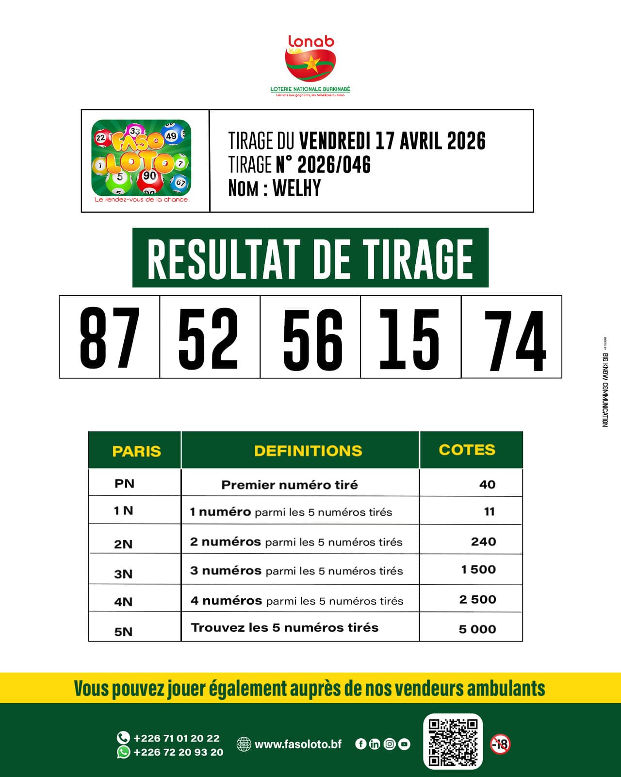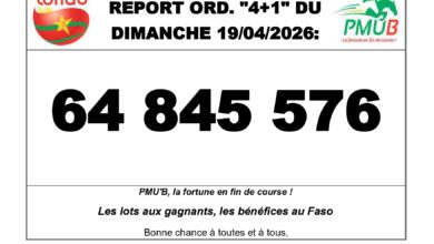 Accueil/Actualité/communiqués de presse/Communiqué | Résultats du tirage du Faso loto WELHY du Vendredi 17 Avril 2026 Communiqué | Résultats du tirage du Faso loto WELHY du Vendredi 17 Avril 2026 Webmaster B24 Envoyer un courriel il y a 6 heures0 Moins d’une minute TIRAGE FASO LOTO 5/90 – « Welhy » Résultats du Tirage – Vendredi 17 Avril 2026 Tirage N° 2026/046 Les numéros gagnants sont : 87 – 52 – 56 – 15 – 74. Et si le prochain millionnaire, c’était vous ? Jouez dès maintenant sur www.fasoloto.bf – rapide, simple et sécurisé Ou rendez-vous chez nos vendeurs ambulants. Faso Loto, le rendez-vous de la chance ! Jeu interdit aux moins de 18 ans. Jouez avec responsabilité. Webmaster B24 Envoyer un courriel il y a 6 heures0 Moins d’une minute Linkedin Messenger Messenger WhatsApp Telegram Partager par email Imprimer