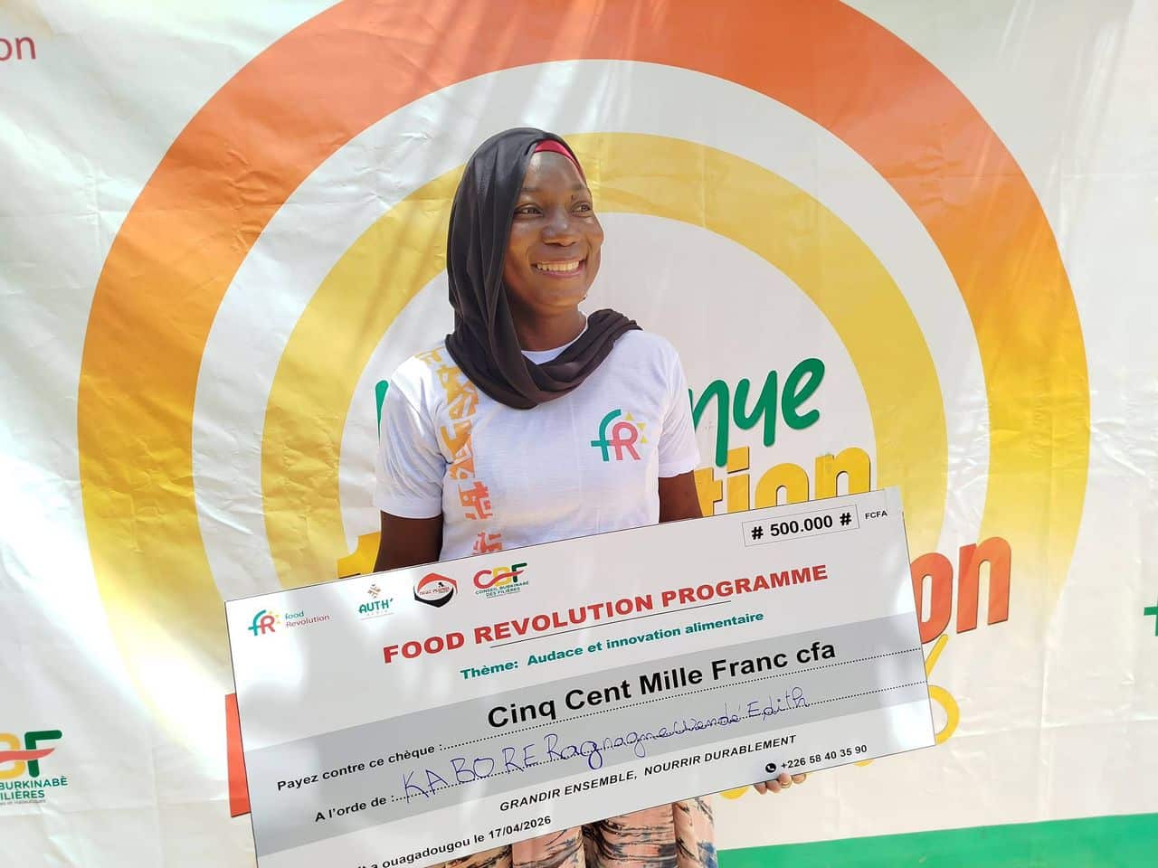 La première édition de la session de formation dédiée à la transformation des produits alimentaires locaux a refermé ses portes, le vendredi 17 avril 2026 à Ouagadougou. Cette initiative, dénommée « Food Révolution », a vu le sacre d’Edwige Kaboré. Avec une note exceptionnelle de 19/20, elle repart avec un chèque de 500 000 FCFA.