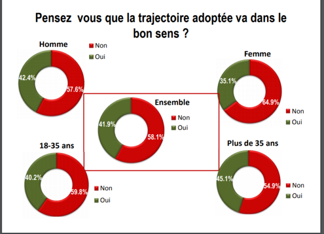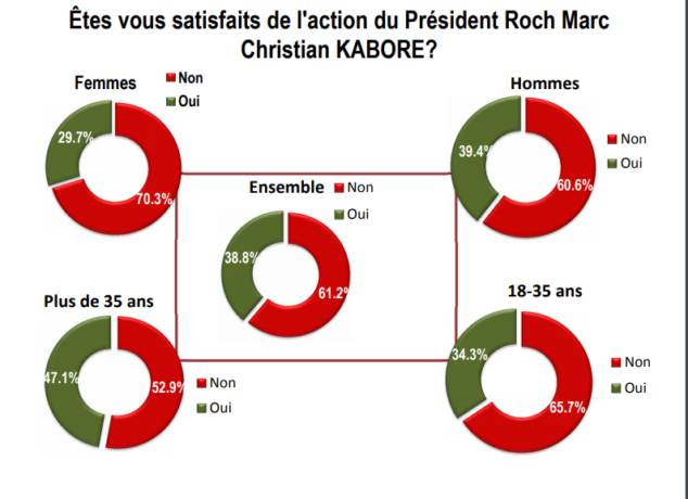 Sur les actions du gouvernement et la capacité du PNDES à mettre en œuvre le programme présidentiel, l’étude a montré que 50% ne font pas confiance contre 35%. Concernant le taux de satisfaction sur l’action du président, 55,4% ne font pas confiance contre 43,7%.