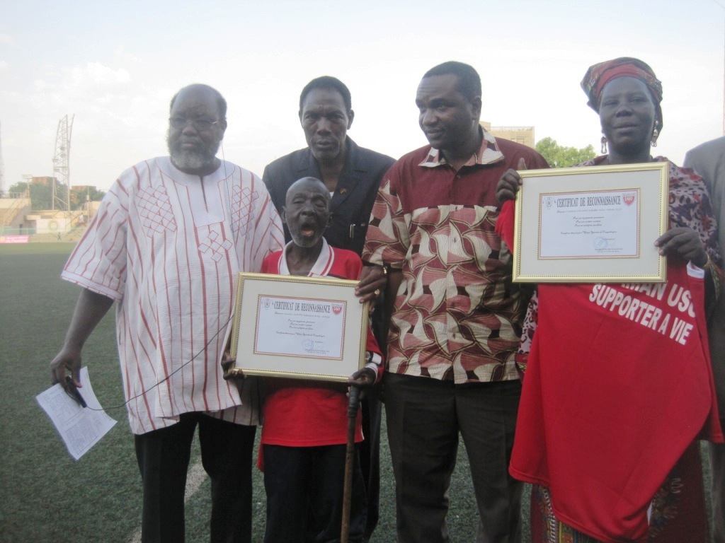 L’Union Sportive de Ouagadougou (USO) est reconnaissante à ses supporters. C’est pourquoi, l’équipe qui a son siège au quartier Larlé, a honoré deux de ses supporters qui s’illustrent par leur amour et leur fidélité indéfectibles à ce club. Madame Camara Djénéba dite « Maman Uso » et Rasmané Sanfo dit « Nabiiga » ont reçu des attestations de reconnaissance et un maillot frappé de leur nom à la mi-temps du match qui a opposé leur équipe à l’Etoile Filante de Ouagadougou (EFO) le dimanche 13 avril 2014 au Stade Municipal de Ouagadougou.