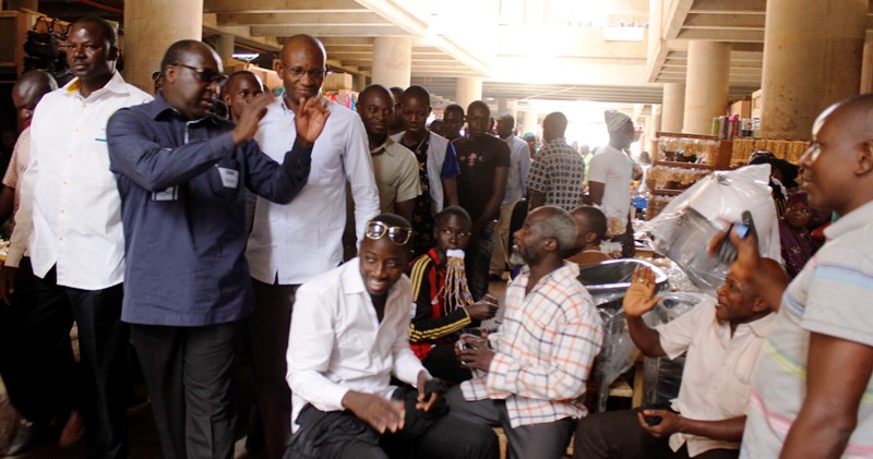 Photo : Zéphirin Diabré saluant des commerçants à Rood-Woko (Copyright F. Yaméogo/L’Obs)