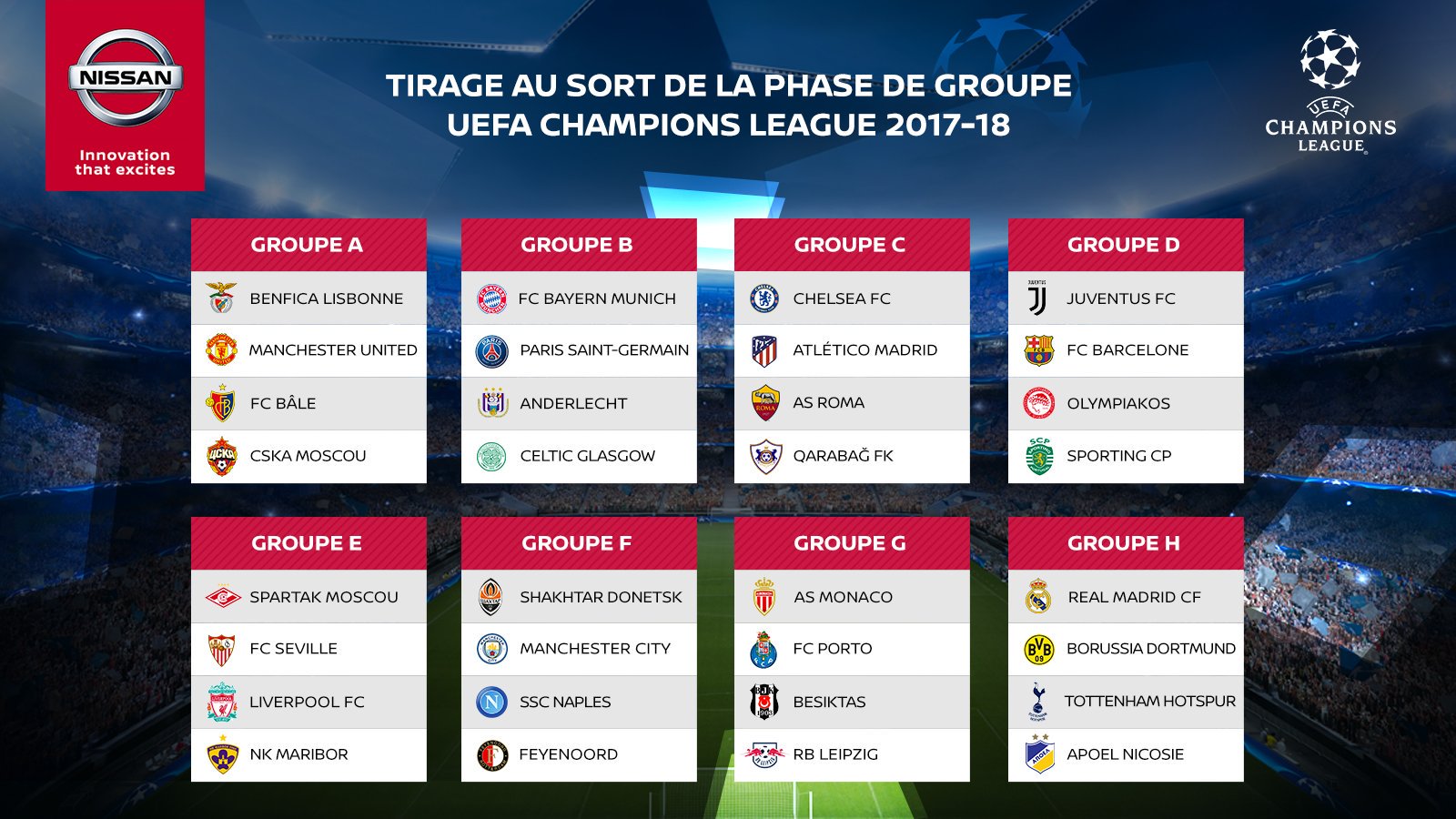 Le tirage au sort de la Ligue des Champions 2017-2018 a eu lieu le jeudi 24 août 2017 à Monaco. Le public européen aura droit déjà à des chocs dès les phases de groupes comme l’opposition entre le PSG et le Bayern de Munich, Real-Dortmund ou Juventus-Barça.